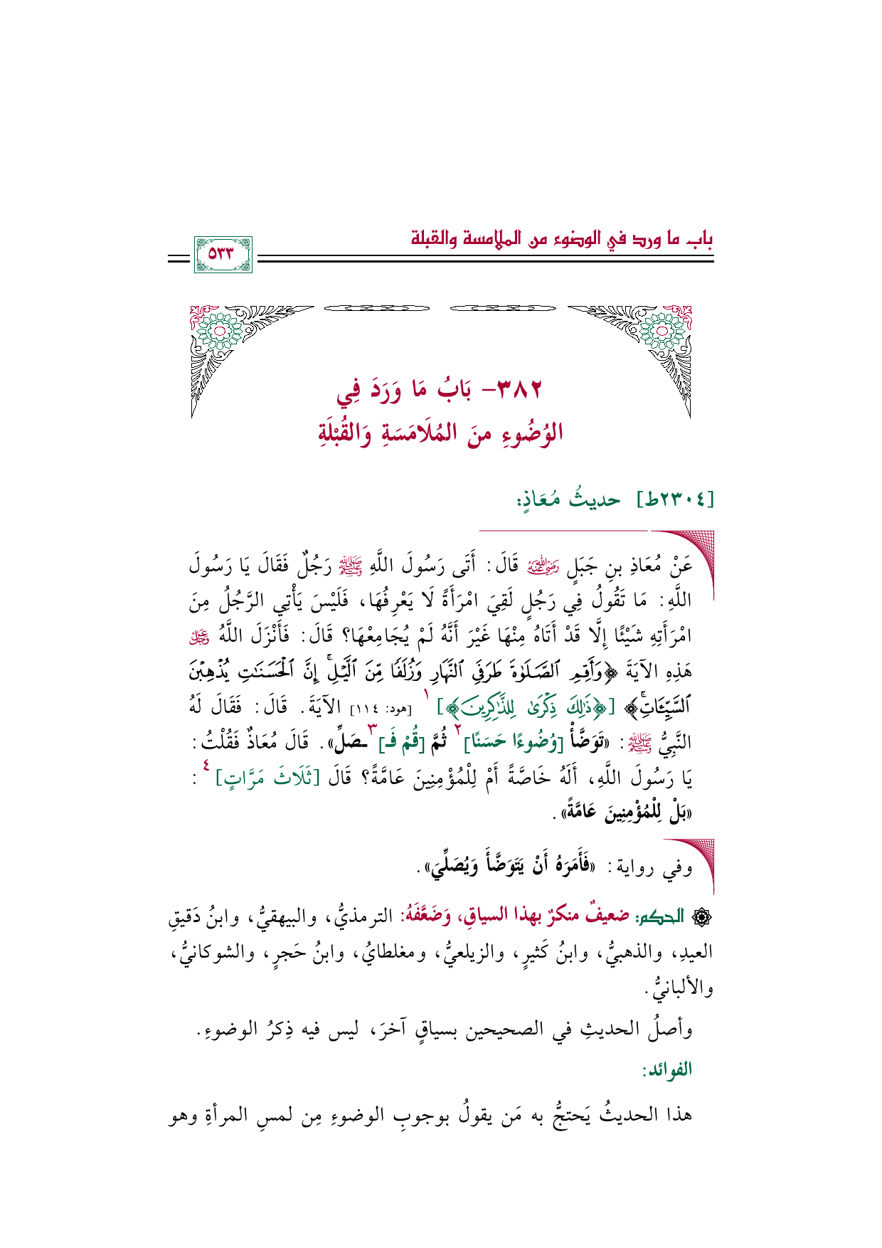 ◼ عَنْ مُعَاذِ بنِ جَبَلٍ رضي الله عنه قَالَ: أَتَى رَسُولَ اللَّهِ صلى الله عليه وسلم رَجُلٌ فَقَالَ يَا رَسُولَ اللَّهِ: مَا تَقُولُ فِي رَجُلٍ لَقِيَ امْرَأَةً لَا يَعْرِفُهَا، فَلَيْسَ يَأْتِي الرَّجُلُ مِنَ امْرَأَتِهِ شَيْئًا إِلَّا قَدْ أَتَاهُ مِنْهَا غَيْرَ أَنَّهُ لَمْ يُجَامِعْهَا؟ قَالَ: فَأَنْزَلَ اللَّهُ عَزَّ وَجَلَّ هَذِهِ الآيَةَ {أَقِمِ الصَّلَاةَ طَرَفَيِ النَّهَارِ وَزُلَفًا مِنَ اللَّيْلِ إِنَّ الحَسَنَاتِ يُذْهِبْنَ السَّيِّئَاتِ} [{ذَلِكَ ذِكْرَى لِلذَّاكِرِينَ}] ١ [هود: ١١٤] الآيَةَ. قَالَ: فَقَالَ لَهُ النَّبِيُّ صلى الله عليه وسلم: ((تَوَضَّأْ [وُضُوءًا حَسَنًا] ٢ ثُمَّ [قُمْ فَـ] ٣ ـصَلِّ)). قَالَ مُعَاذٌ فَقُلْتُ: يَا رَسُولَ اللَّهِ، أَلَهُ خَاصَّةً أَمْ لِلْمُؤْمِنِينَ عَامَّةً؟ قَالَ [ثَلَاثَ مَرَّاتٍ] ٤: ((بَلْ لِلْمُؤْمِنِينَ عَامَّةً)).
