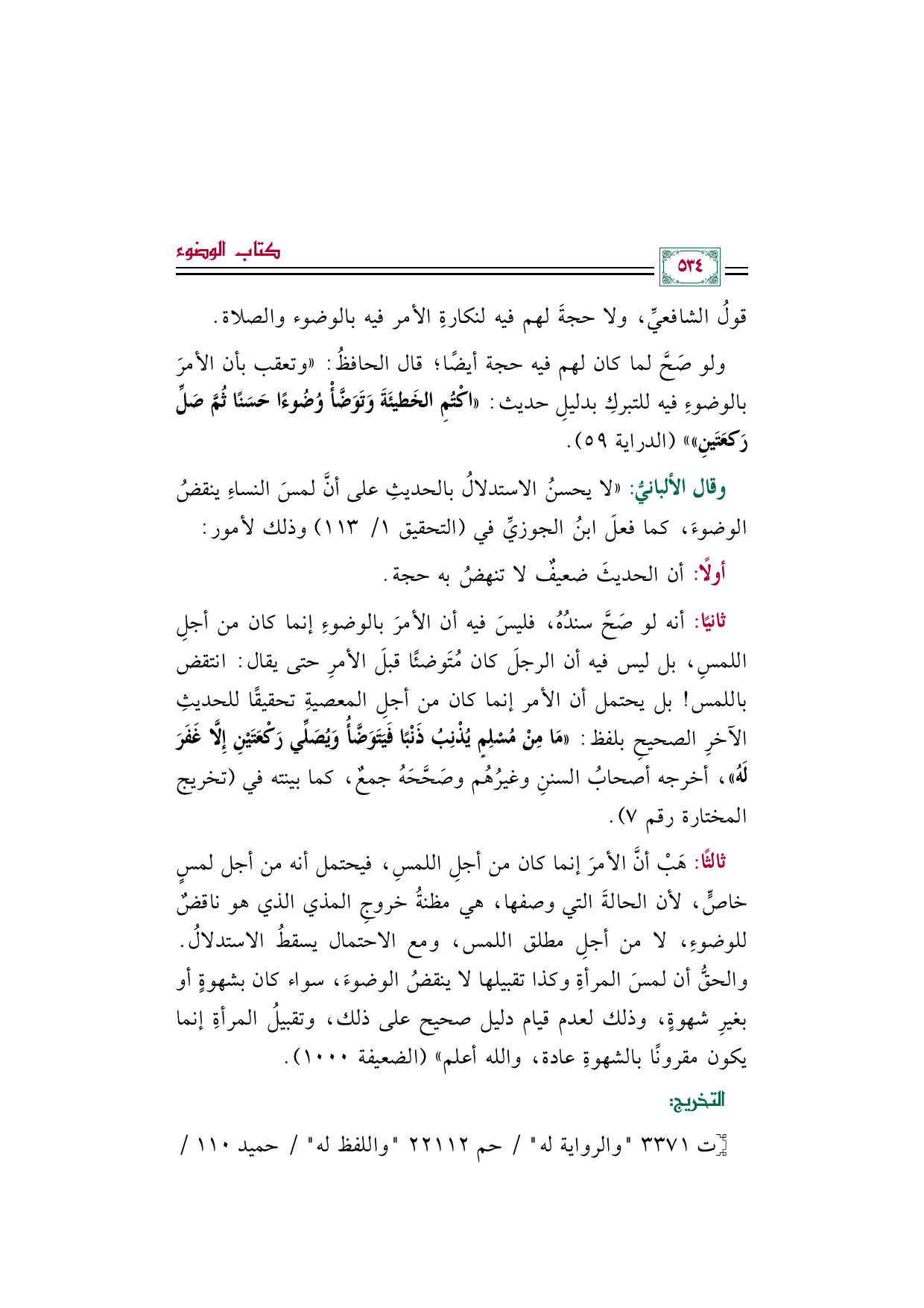 ثانيًا: أنه لو صَحَّ سندُهُ، فليسَ فيه أن الأمرَ بالوضوءِ إنما كان من أجلِ اللمسِ، بل ليس فيه أن الرجلَ كان مُتَوضئًا قبلَ الأمرِ حتى يقال: انتقض باللمس! بل يحتمل أن الأمر إنما كان من أجلِ المعصيةِ تحقيقًا للحديثِ الآخرِ الصحيحِ بلفظ: ((مَا مِنْ مُسْلِمٍ يُذْنِبُ ذَنْبًا فَيَتَوَضَّأُ وَيُصَلِّي رَكْعَتَيْنِ إِلَّا غَفَرَ لَهُ))، أخرجه أصحابُ السننِ وغيرُهُم وصَحَّحَهُ جمعٌ، كما بينته في (تخريج المختارة رقم ٧).