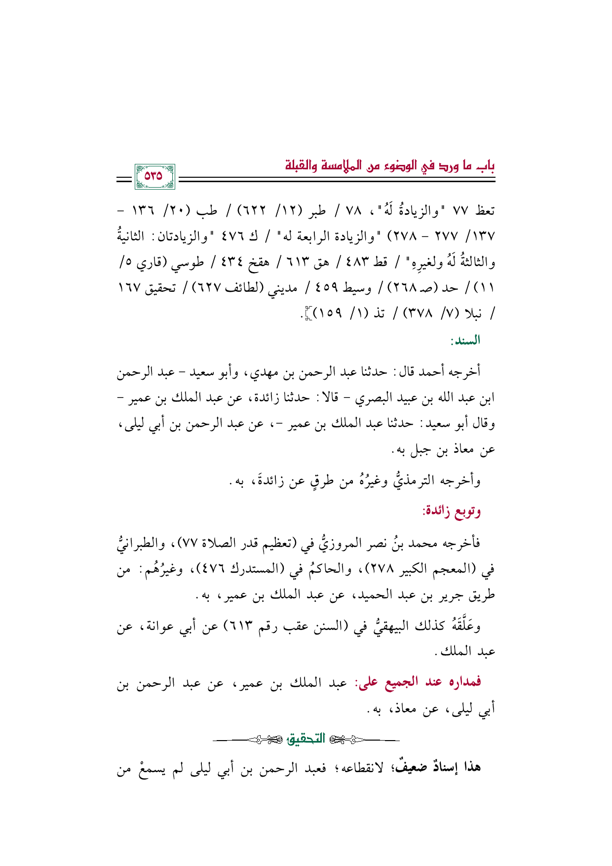 أخرجه أحمد قال: حدثنا عبد الرحمن بن مهدي، وأبو سعيد -عبد الرحمن بن عبد الله بن عبيد البصري- قالا: حدثنا زائدة، عن عبد الملك بن عمير -وقال أبو سعيد: حدثنا عبد الملك بن عمير-، عن عبد الرحمن بن أبي ليلى، عن معاذ بن جبل به.
