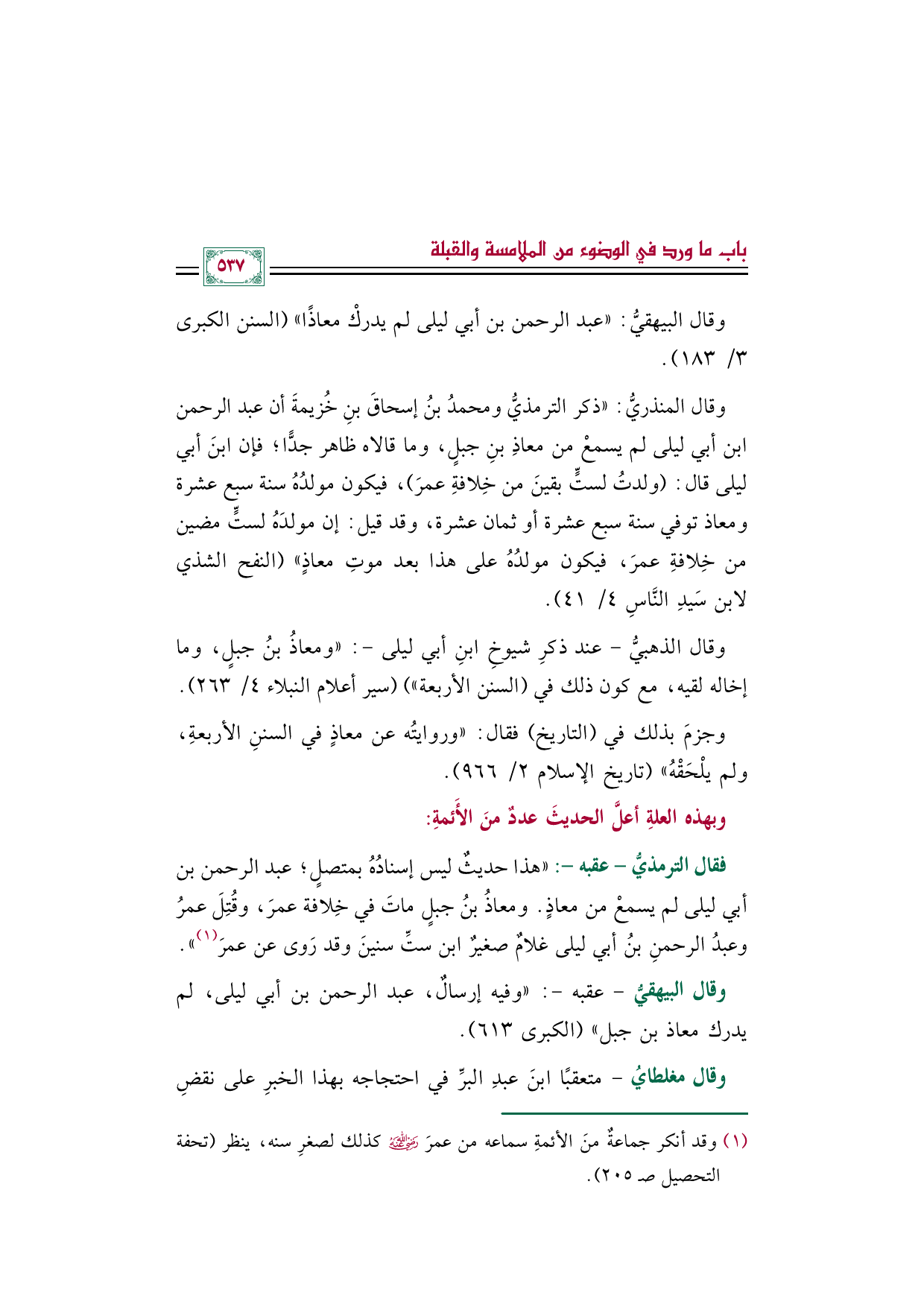 وقال البيهقيُّ: ((عبد الرحمن بن أبي ليلى لم يدركْ معاذًا)) (السنن الكبرى ٣/ ١٨٣).