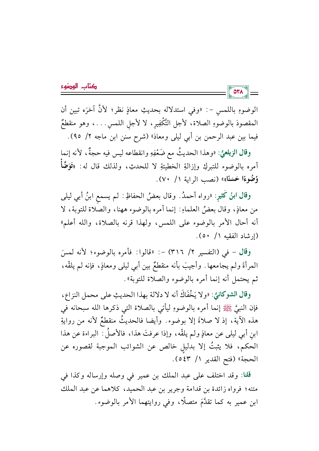 وقال ابنُ كَثيرٍ: ((رواه أحمدُ. وقال بعضُ الحفاظِ: لم يسمعِ ابنُ أبي ليلى من معاذٍ، وقال بعضُ العلماءِ: إنما أمره بالوضوء ههنا، والصلاة للتوبة، لا أنه أحال الأمر بالوضوء على اللمس، ولهذا قرنه بالصلاة، والله أعلم)) (إرشاد الفقيه ١/ ٥٠).
