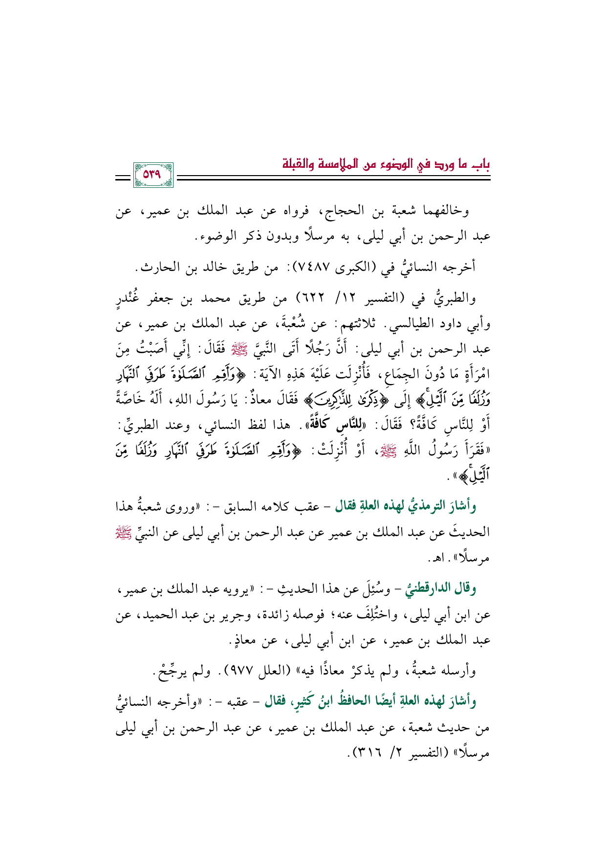 والطبريُّ في (التفسير ١٢/ ٦٢٢) من طريق محمد بن جعفر غُنْدرٍ وأبي داود الطيالسي. ثلاثتهم: عن شُعْبةَ، عن عبد الملك بن عمير، عن عبد الرحمن بن أبي ليلى: أَنَّ رَجُلًا أَتَى النَّبيَّ صلى الله عليه وسلم فَقَالَ: إِنِّي أَصَبْتُ مِنَ امْرَأَةٍ مَا دُونَ الجِمَاعِ، فَأُنْزِلَت عَلَيْهَ هَذِهِ الآيَة: {أَقِمِ الصَّلاةَ طَرَفَيِ النَّهَارِ وَزُلَفًا مِنَ اللَّيْلِ} إِلَى {ذِكْرَى لِلذَّاكِرِينَ} فَقَالَ معاذٌ: يَا رَسُولَ اللهِ، أَلَهُ خَاصَّةً أَوْ لِلنَّاسِ كَافَّةً؟ فَقَالَ: ((لِلنَّاسِ كَافَّةً)). هذا لفظ النسائي، وعند الطبريِّ: ((فَقَرَأَ رَسُولُ اللَّهِ صلى الله عليه وسلم، أَوْ أُنْزِلَتْ: {أَقِمِ الصَّلَاةَ طَرَفَيِ النَّهَارِ وَزُلَفًا مِنَ اللَّيْلِ})).