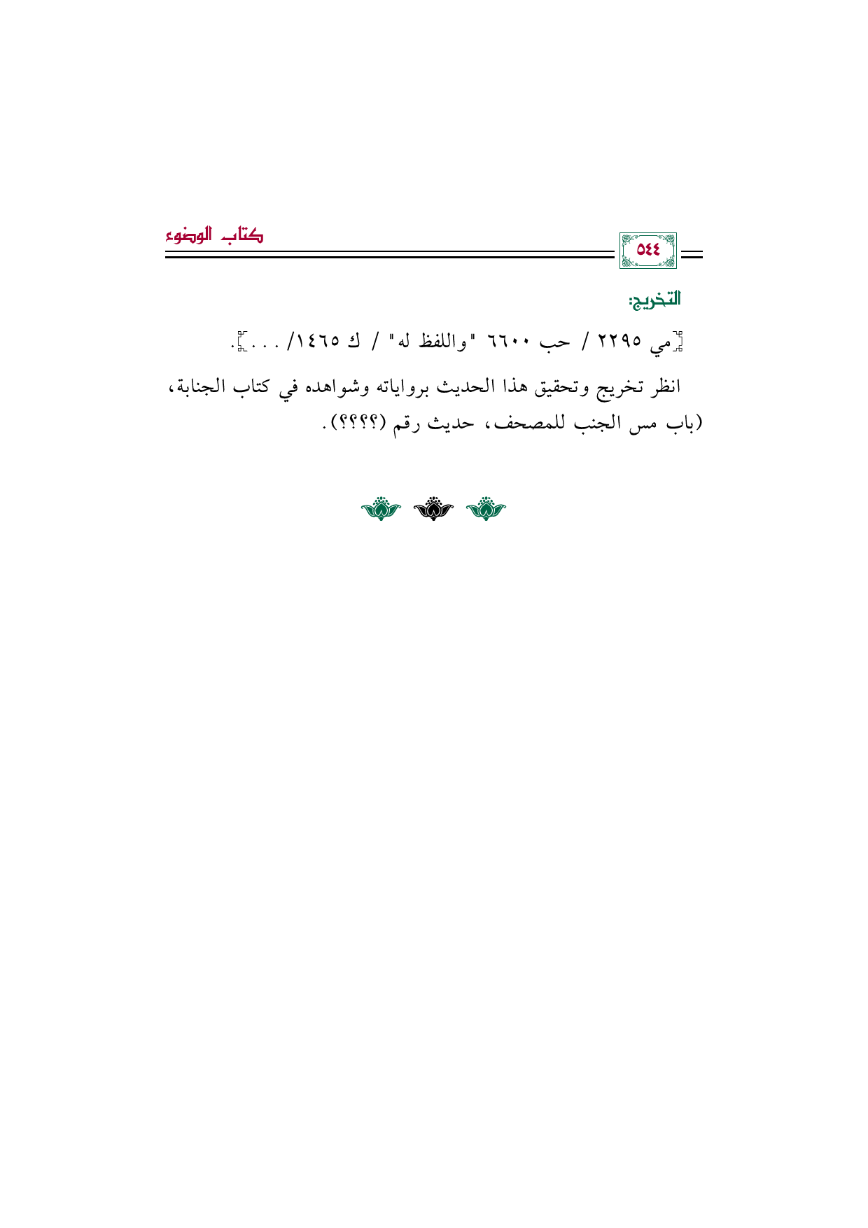 انظر تخريج وتحقيق هذا الحديث برواياته وشواهده في كتاب الجنابة، (باب مس الجنب للمصحف، حديث رقم (؟ ؟ ؟ ؟ ).