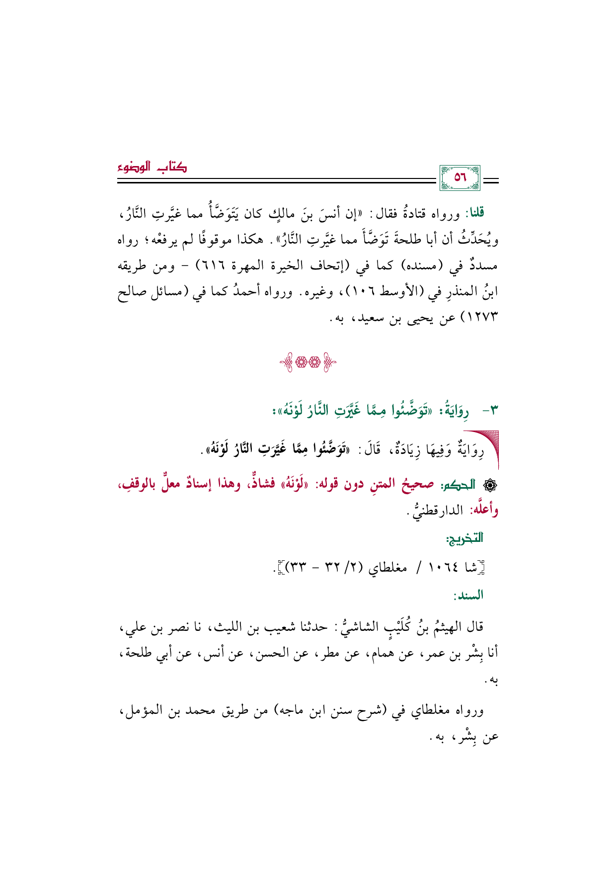 قلنا: ورواه قتادةُ فقال: ((إن أنسَ بنَ مالكٍ كان يَتَوَضَّأُ مما غيَّرتِ النَّارُ، ويُحَدِّثُ أن أبا طلحةَ تَوَضَّأَ مما غيَّرتِ النَّارُ)). هكذا موقوفًا لم يرفعْه؛ رواه مسددٌ في (مسنده) كما في (إتحاف الخيرة المهرة ٦١٦) -ومن طريقه ابنُ المنذرِ في (الأوسط ١٠٦)، وغيره. ورواه أحمدُ كما في (مسائل صالح ١٢٧٣) عن يحيى بن سعيد، به.
