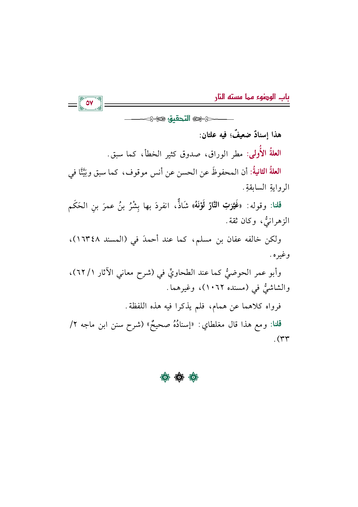 قلنا: وقوله: ((غَيَّرَتِ النَّارُ لَوْنَهُ)) شَاذٌّ، انفردَ بها بِشْرُ بنُ عمرَ بنِ الحَكَم الزهرانيُّ، وكان ثقة.