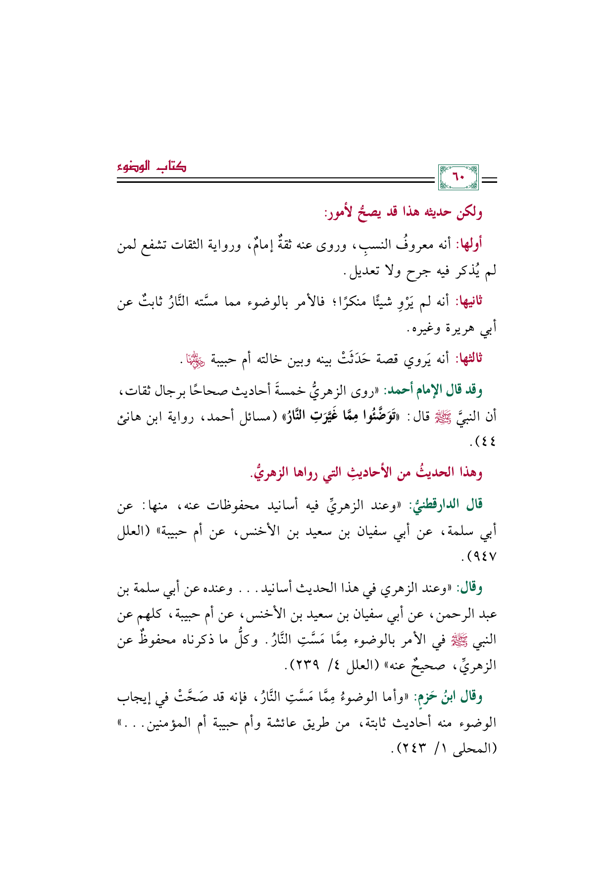 وقال: ((وعند الزهري في هذا الحديث أسانيد ... وعنده عن أبي سلمة بن عبد الرحمن، عن أبي سفيان بن سعيد بن الأخنس، عن أم حبيبة، كلهم عن النبي صلى الله عليه وسلم في الأمر بالوضوء مِمَّا مَسَّتِ النَّارُ. وكلُّ ما ذكرناه محفوظٌ عن الزهريِّ، صحيحٌ عنه)) (العلل ٤/ ٢٣٩).