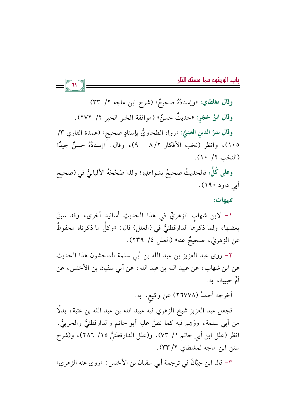 وقال بدرُ الدينِ العينيُّ: ((رواه الطحاويُّ بإسنادٍ صحيحٍ)) (عمدة القاري ٣/ ١٠٥)، وانظر (نخب الأفكار ٢/ ٨ - ٩)، وقال: ((إسنادُهُ حسنٌ جيدٌ)) (النخب ٢/ ١٠).