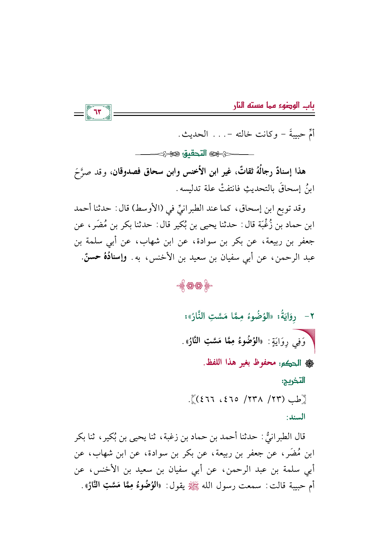 قال الطبرانيُّ: حدثنا أحمد بن حماد بن زغبة، ثنا يحيى بن بُكير، ثنا بكر بن مُضَر، عن جعفر بن ربيعة، عن بكر بن سوادة، عن ابن شهاب، عن أبي سلمة بن عبد الرحمن، عن أبي سفيان بن سعيد بن الأخنس، عن أم حبيبة قالت: سمعت رسول الله صلى الله عليه وسلم يقول: ((الوُضُوءُ مِمَّا مَسَّتِ النَّارُ)).