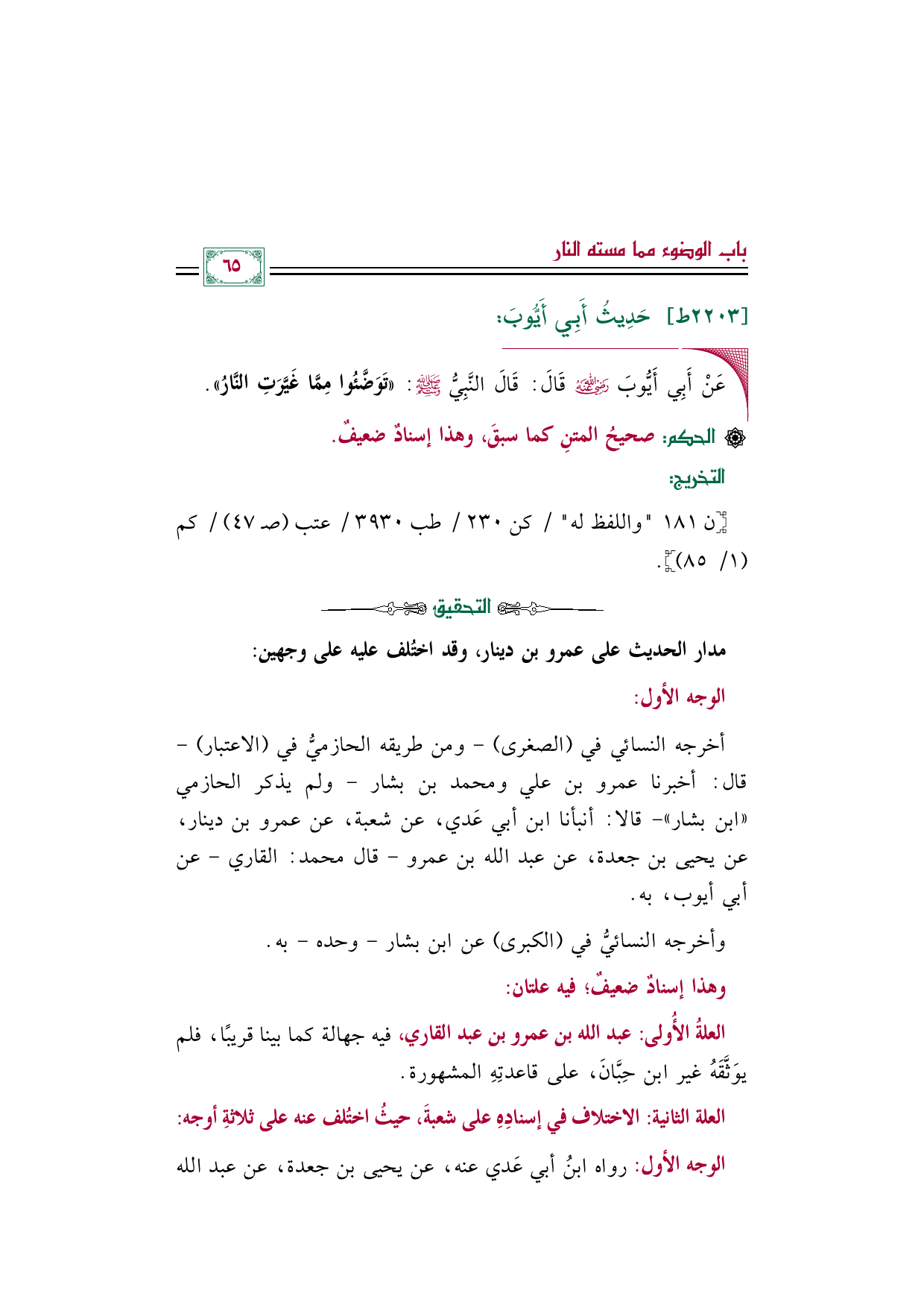◼ عَنْ أَبِي أَيُّوبَ رضي الله عنه قَالَ: قَالَ النَّبِيُّ صلى الله عليه وسلم: ((تَوَضَّئُوا مِمَّا غَيَّرَتِ النَّارُ)).