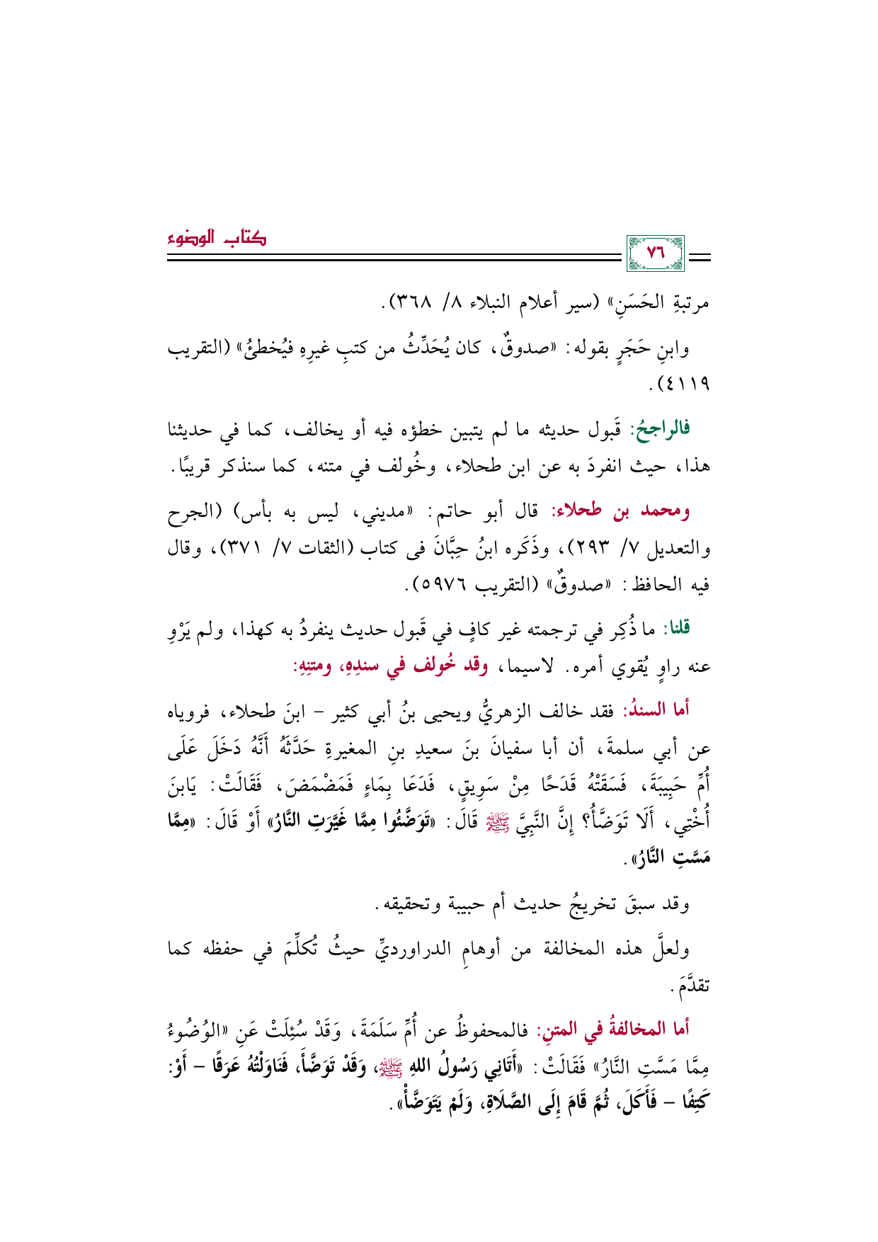 أما السندُ: فقد خالف الزهريُّ ويحيى بنُ أبي كثير- ابنَ طحلاء، فروياه عن أبي سلمةَ، أن أبا سفيانَ بنَ سعيدِ بنِ المغيرةِ حَدَّثَهُ أَنَّهُ دَخَلَ عَلَى أُمِّ حَبِيبَةَ، فَسَقَتْهُ قَدَحًا مِنْ سَوِيقٍ، فَدَعَا بِمَاءٍ فَمَضْمَضَ، فَقَالَتْ: يَابنَ أُخْتِي، أَلَا تَوَضَّأُ؟ إِنَّ النَّبِيَّ صلى الله عليه وسلم قَالَ: ((تَوَضَّئُوا مِمَّا غَيَّرَتِ النَّارُ)) أَوْ قَالَ: ((مِمَّا مَسَّتِ النَّارُ)).