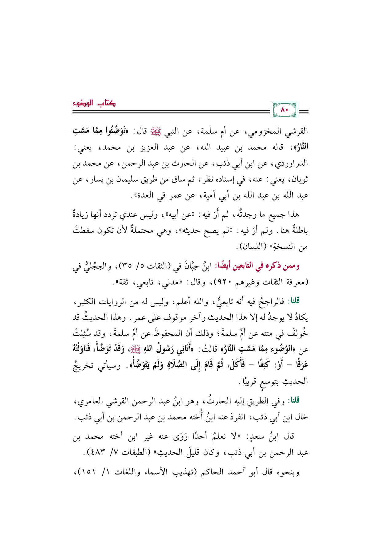القرشي المخزومي، عن أم سلمة، عن النبي صلى الله عليه وسلم قال: ((تَوَضَّئُوا مِمَّا مَسَّتِ النَّارُ))، قاله محمد بن عبيد الله، عن عبد العزيز بن محمد، يعني: الدراوردي، عن ابن أبي ذئب، عن الحارث بن عبد الرحمن، عن محمد بن ثوبان، يعني: عنه، في إسناده نظر، ثم ساق من طريق سليمان بن يسار، عن عبد الله بن عبد الله بن أبي أمية، عن عمر في العدة)).