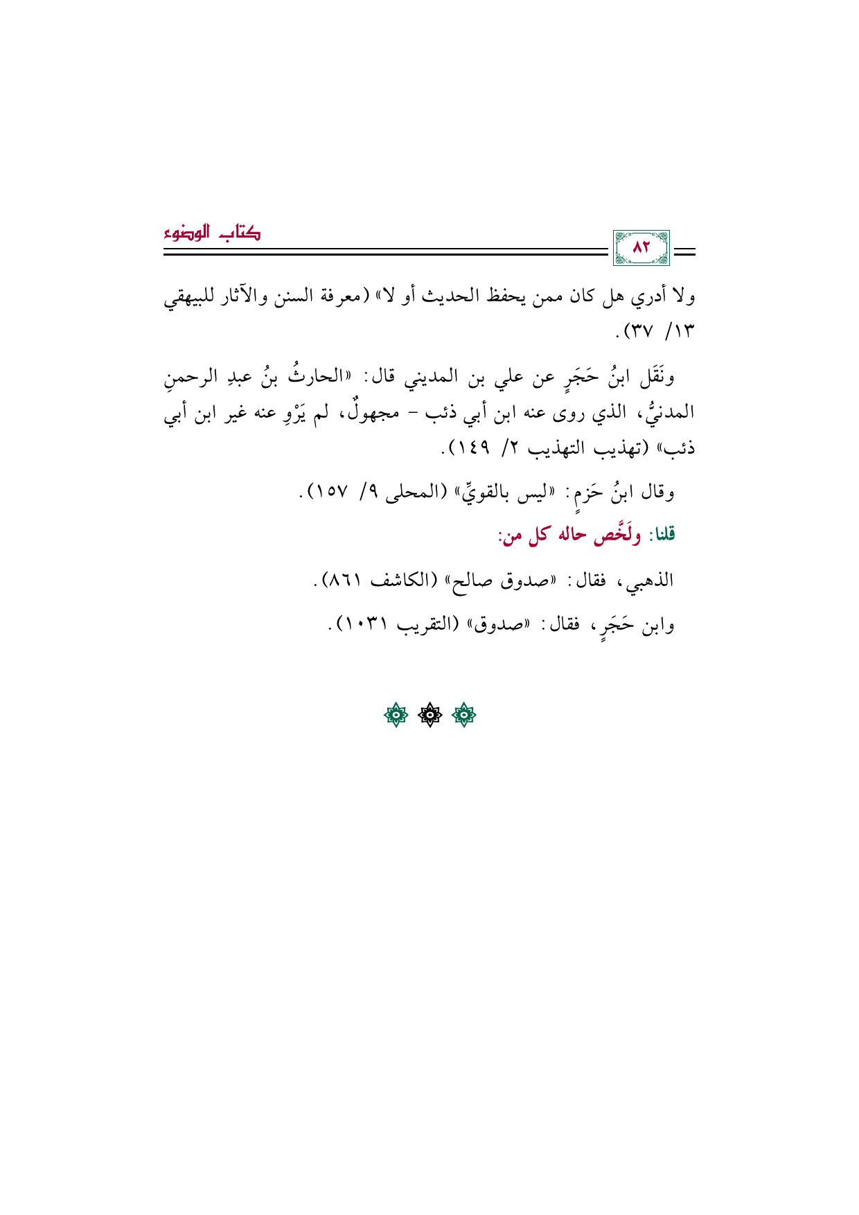 ونَقَل ابنُ حَجَرٍ عن علي بن المديني قال: ((الحارثُ بنُ عبدِ الرحمنِ المدنيُّ، الذي روى عنه ابن أبي ذئب- مجهولٌ، لم يَرْوِ عنه غير ابن أبي ذئب)) (تهذيب التهذيب ٢/ ١٤٩).