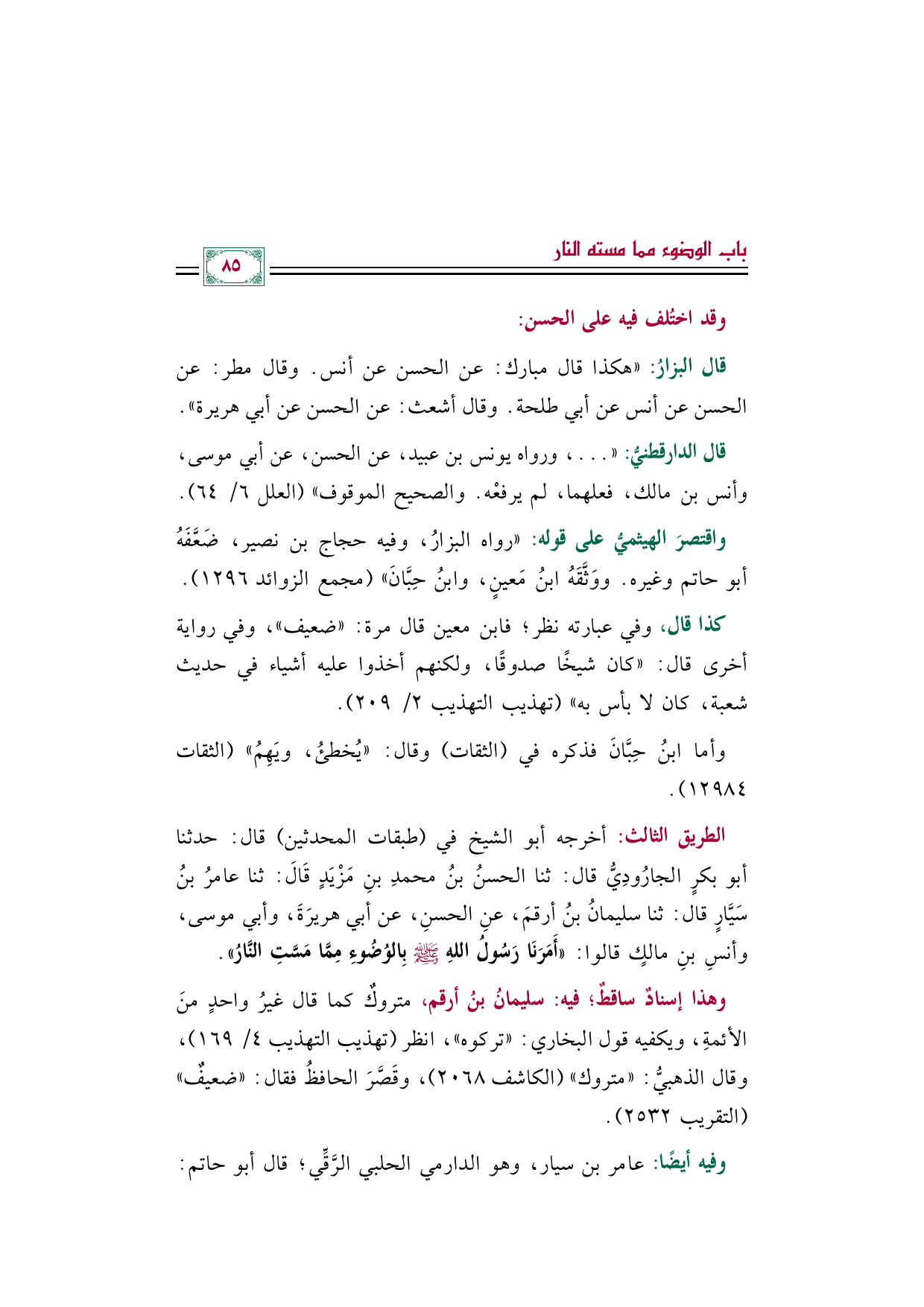 الطريق الثالث: أخرجه أبو الشيخ في (طبقات المحدثين) قال: حدثنا أبو بكرٍ الجارُودِيُّ قال: ثنا الحسنُ بنُ محمدِ بنِ مَزْيَدٍ قَالَ: ثنا عامرُ بنُ سَيَّارٍ قال: ثنا سليمانُ بنُ أرقمَ، عنِ الحسنِ، عن أبي هريرَةَ، وأبي موسى، وأنسِ بنِ مالكٍ قالوا: ((أَمَرَنَا رَسُولُ اللهِ صلى الله عليه وسلم بِالوُضُوءِ مِمَّا مَسَّتِ النَّارُ)).
