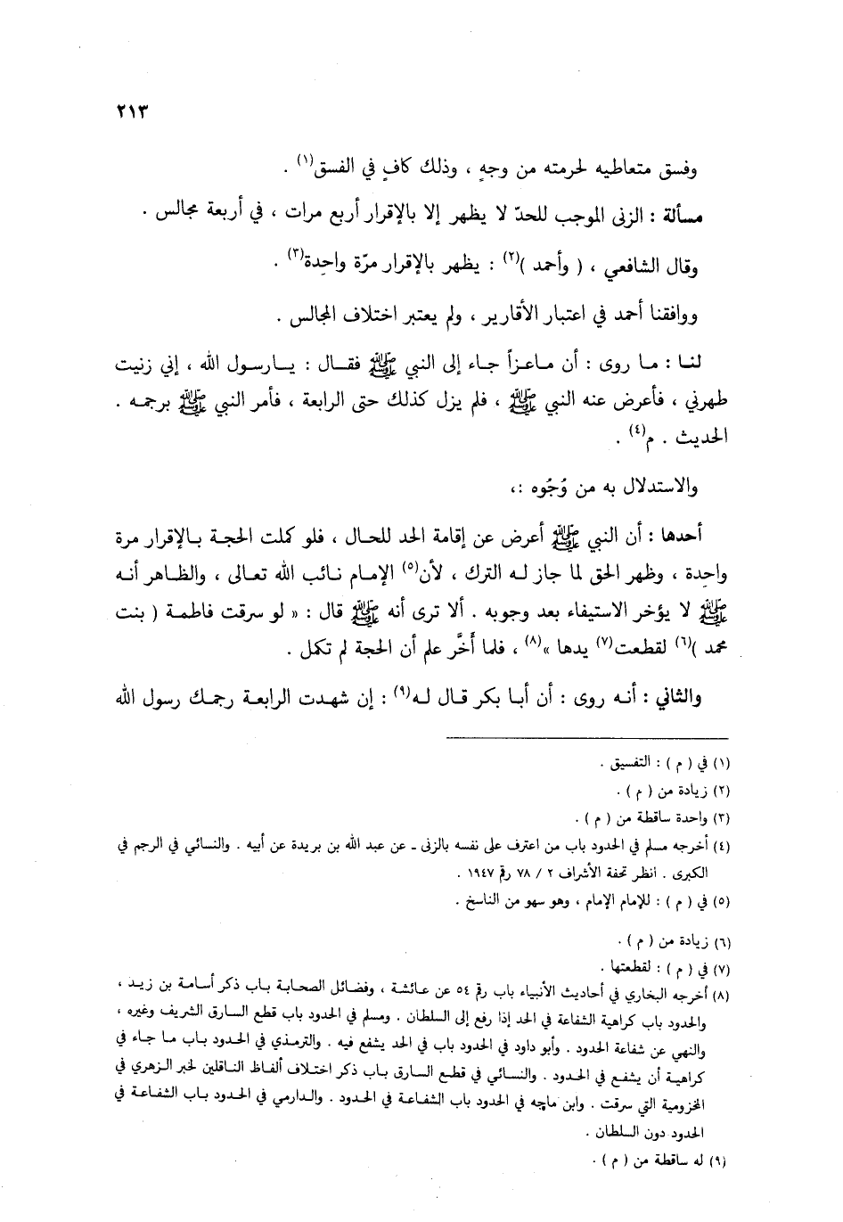 أَحدهَا أَن النَّبِي صلى الله عَلَيْهِ وَسلم أعرض عَن إِقَامَة الْحَد للْحَال فَلَو كملت الْحجَّة بِالْإِقْرَارِ مرّة وَاحِدَة وَظهر الْحق لما جَازَ لَهُ التّرْك لِأَن الإِمَام نَائِب الله تَعَالَى وَالظَّاهِر أَنه صلى الله عَلَيْهِ وَسلم لَا يُؤَخر الِاسْتِيفَاء بعد وُجُوبه أَلا ترى أَنه صلى الله عَلَيْهِ وَسلم قَالَ لَو سرقت فَاطِمَة بنت مُحَمَّد لَقطعت يَدهَا فَلَمَّا أخر علم أَن الْحجَّة لم تكمل