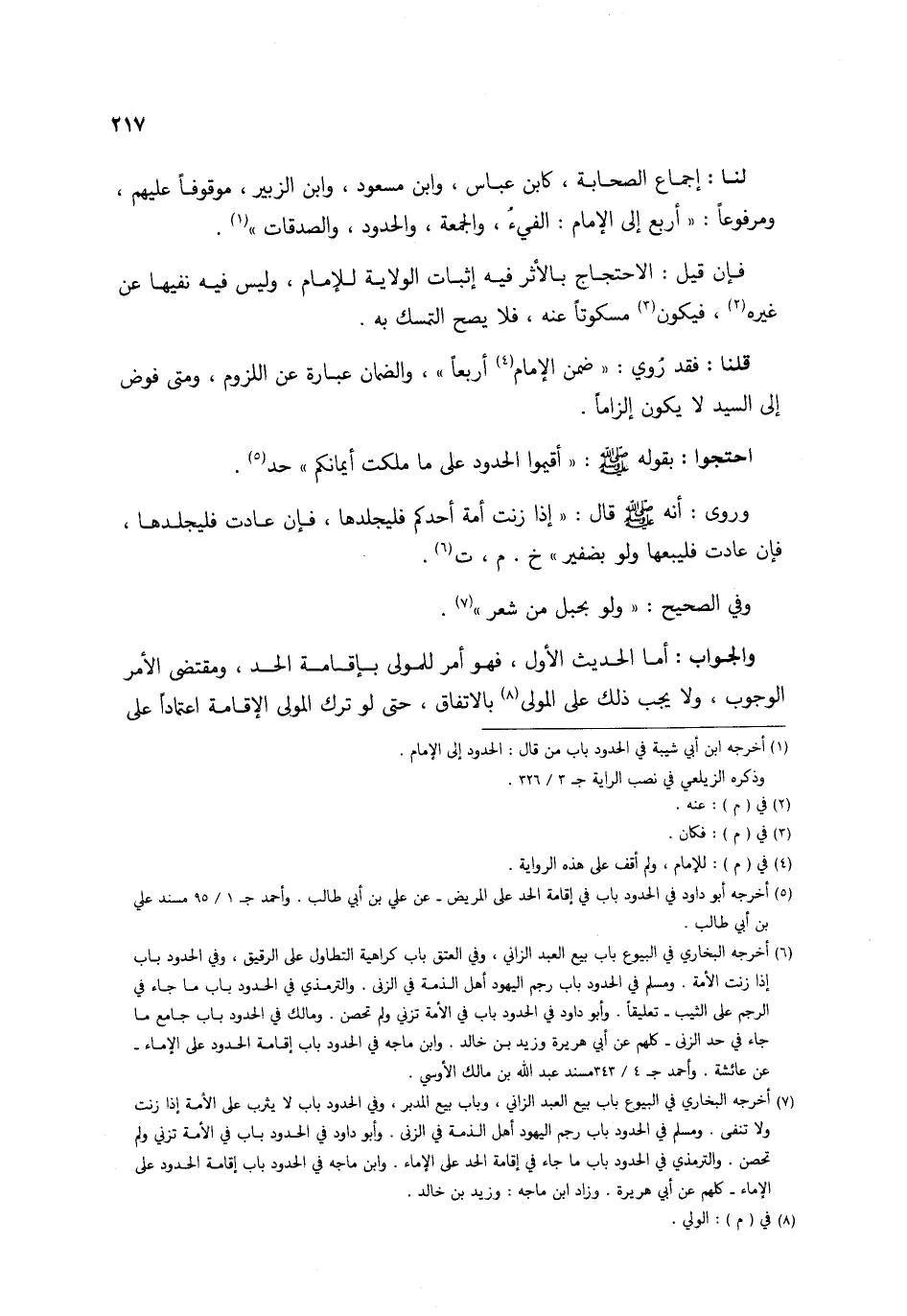 قُلْنَا فقد رُوِيَ ضمن الإِمَام أَرْبعا وَالضَّمان عبارَة عَن اللُّزُوم وَمَتى فوض إِلَى السَّيِّد لَا يكون إلزاما احْتَجُّوا بقوله صلى الله عَلَيْهِ وَسلم أقِيمُوا الْحُدُود على مَا ملكت أيمانك حد