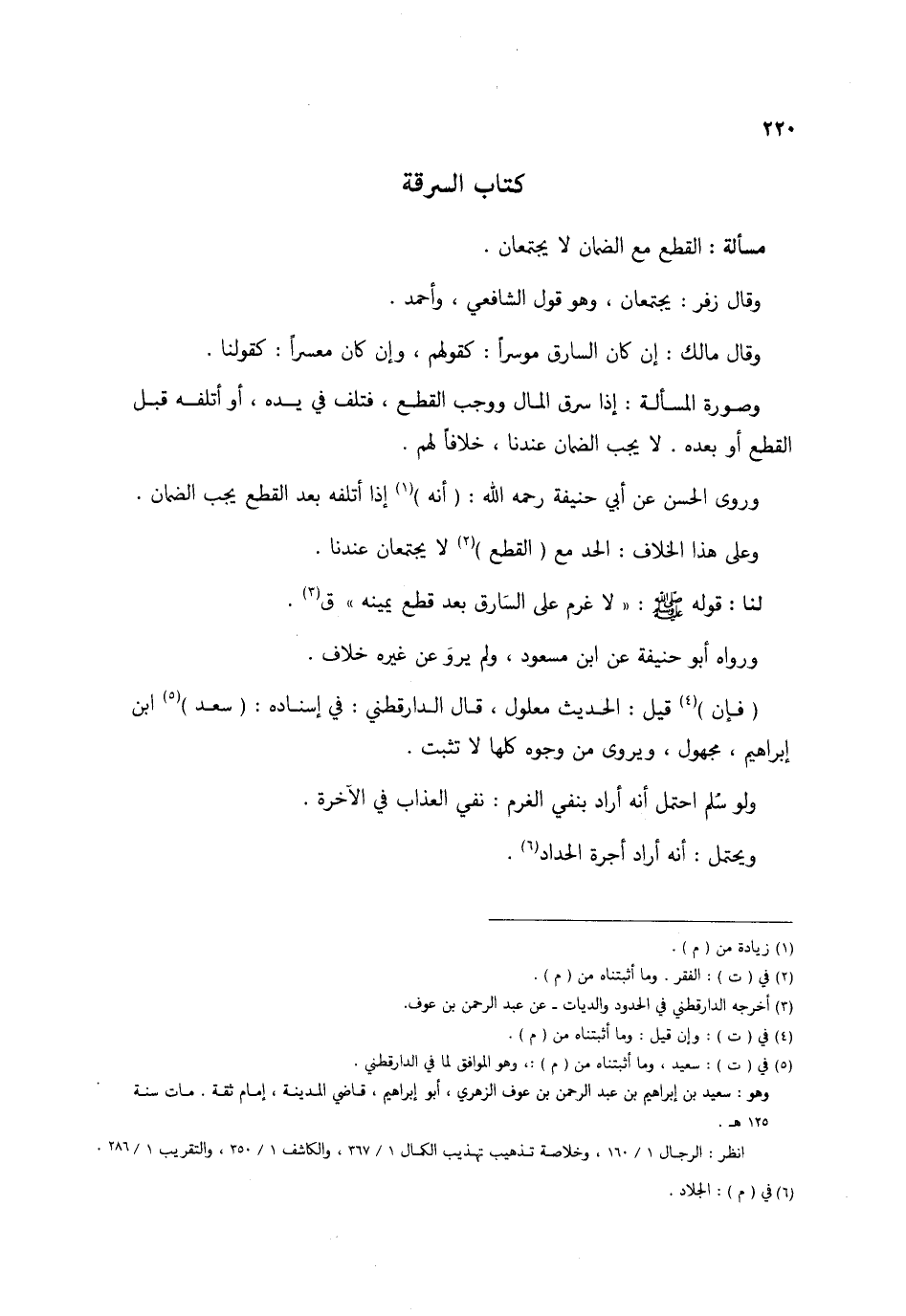 = كتاب السّرقَة = مَسْأَلَة الْقطع مَعَ الضَّمَان لَا يَجْتَمِعَانِ وَقَالَ زفر يَجْتَمِعَانِ وَهُوَ قَول الشَّافِعِي وَأحمد وَقَالَ مَالك إِن كَانَ السَّارِق مُوسِرًا كَقَوْلِهِم وَإِن كَانَ ممعسرا كَقَوْلِنَا