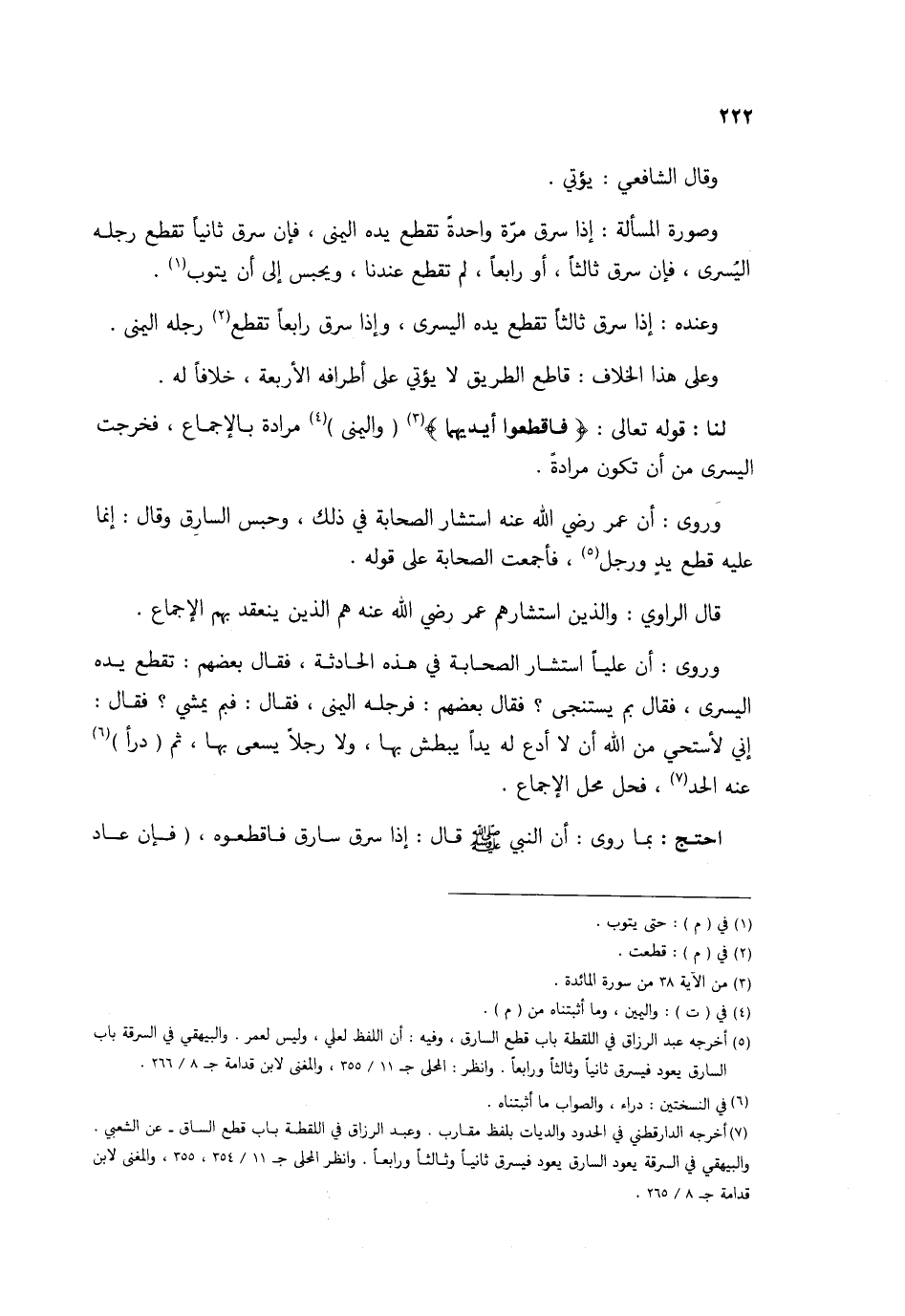 وَرُوِيَ أَن عليا اسْتَشَارَ الصَّحَابَة فِي هَذِه الْحَادِثَة فَقَالَ بَعضهم تقطع يَده الْيُسْرَى فَقَالَ بِمَ يستنجي فَقَالَ بَعضهم فرجله الْيُمْنَى فَقَالَ فَبِمَ يمشي فَقَالَ إِنِّي لأَسْتَحي من الله أَن لَا أدع لَهُ يدا يبطش بهَا وَلَا رجلا يسْعَى بهَا ثمَّ دَرأ عَنهُ الْحَد فَحل مَحل الْإِجْمَاع