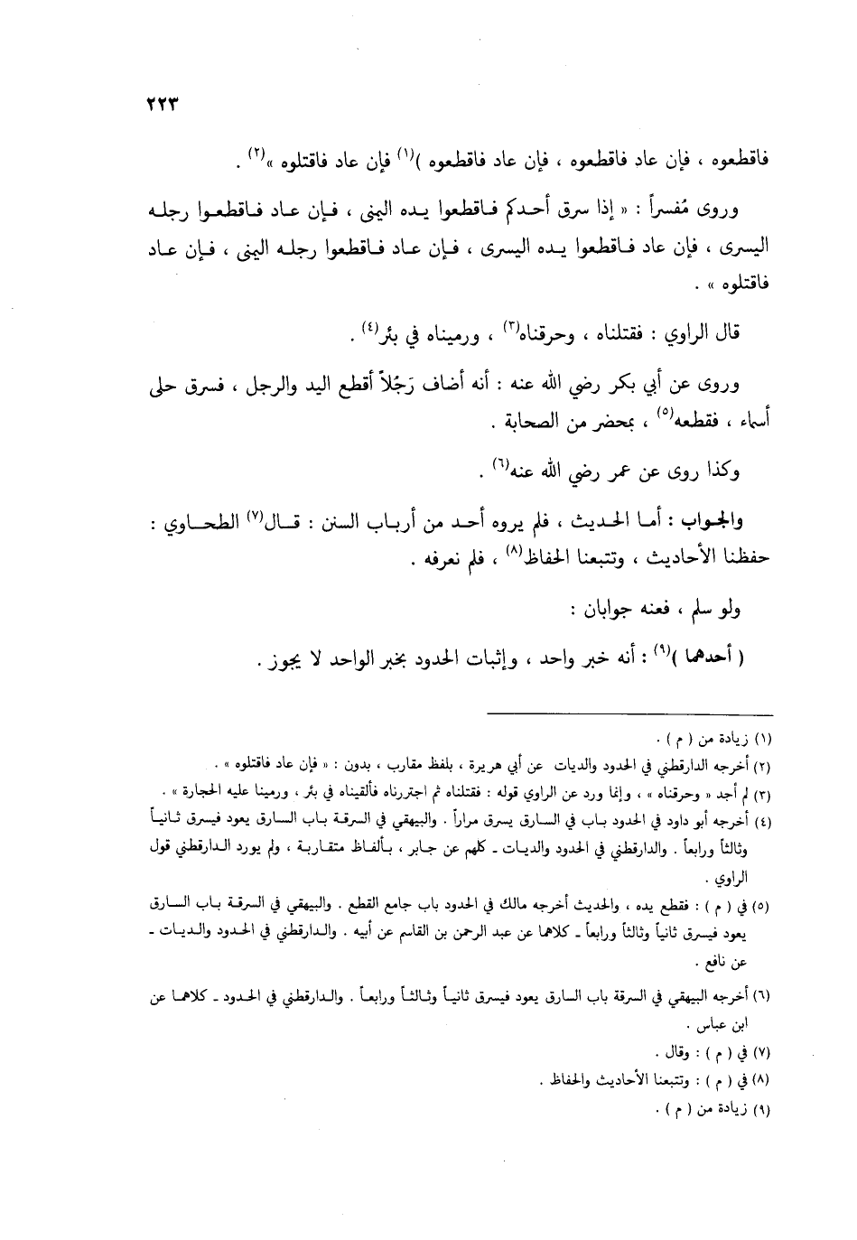 وروى مُفَسرًا إِذا سرق أحدكُم فَاقْطَعُوا يَده الْيُمْنَى فَإِن عَاد فَاقْطَعُوا رجله الْيُسْرَى فَإِن عَاد فَاقْطَعُوا يَده الْيُسْرَى فَإِن عَاد فَاقْطَعُوا رجله الْيُمْنَى فَإِن عَاد فَاقْتُلُوهُ قَالَ الرَّاوِي فقتلناه وحرقناه ورميناه فِي بِئْر