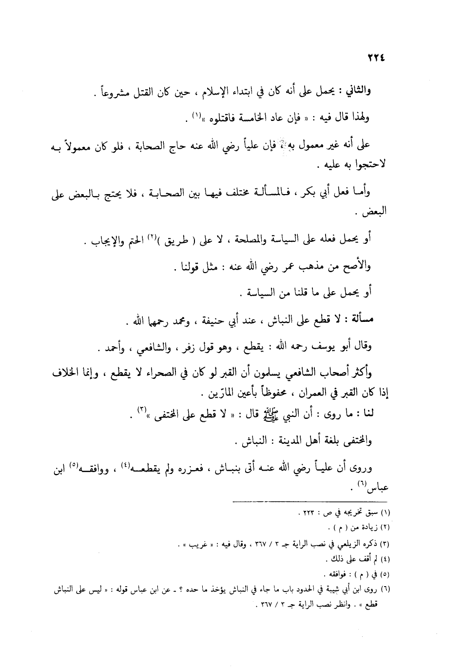 على أَنه غير مَعْمُول بِهِ فَإِن عليا رَضِي الله عَنهُ حَاج الصَّحَابَة فَلَو كَانَ مَعْمُولا بِهِ لاحتجوا بِهِ عَلَيْهِ وَأما فعل أبي بكر فَالْمَسْأَلَة مُخْتَلف فِيهَا بَين الصَّحَابَة فَلَا يحْتَج بِالْبَعْضِ على الْبَعْض أَو يحمل فعله على السياسة والمصلحة لَا على طَرِيق الحتم والإيجاب والإصح من مَذْهَب عمر رَضِي الله عَنهُ مثل قَوْلنَا أَو يحمل على مَا قُلْنَا من السياسة مَسْأَلَة لَا قطع على النباش عِنْد أبي حنيفَة وَمُحَمّد رحمهمَا الله وَقَالَ أَبُو يُوسُف رَحمَه الله يقطع وَهُوَ قَول زفر وَالشَّافِعِيّ وَاحْمَدْ