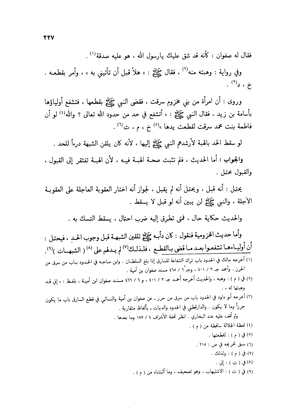 وَرُوِيَ أَن امْرَأَة من بني مَخْزُوم سرقت فَقضى النَّبِي صلى الله عَلَيْهِ وَسلم بقطعها فتشفع أولياؤها بأسامة بن زيد فَقَالَ النَّبِي صلى الله عَلَيْهِ وَسلم أَتَشفع فِي حد من حُدُود الله تَعَالَى وَالله لَو أَن فَاطِمَة بنت مُحَمَّد سرقت لَقطعت يَدهَا خَ م ت لَو سقط الْحَد بِالْهبةِ لأرشدهم النَّبِي صلى الله عَلَيْهِ وَسلم إِلَيْهَا لِأَنَّهُ كَانَ يلقن الشُّبْهَة درءا للحد وَالْجَوَاب أما الحَدِيث فَلم تثبت صِحَة الْهِبَة فِيهِ لِأَن الْهِبَة تفْتَقر إِلَى الْقبُول وَالْقَبُول مُحْتَمل