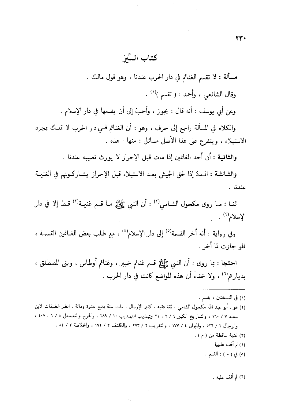 = كتاب السّير = مَسْأَلَة لَا تقسم الْغَنَائِم فِي دَار الْحَرْب عندنَا وَهُوَ قَول مَالك وَقَالَ الشَّافِعِي وَاحْمَدْ تقسم وَعَن أبي يُوسُف أَنه قَالَ يجوز وَأحب إِلَيّ أَن يقسمها فِي دَار الْإِسْلَام