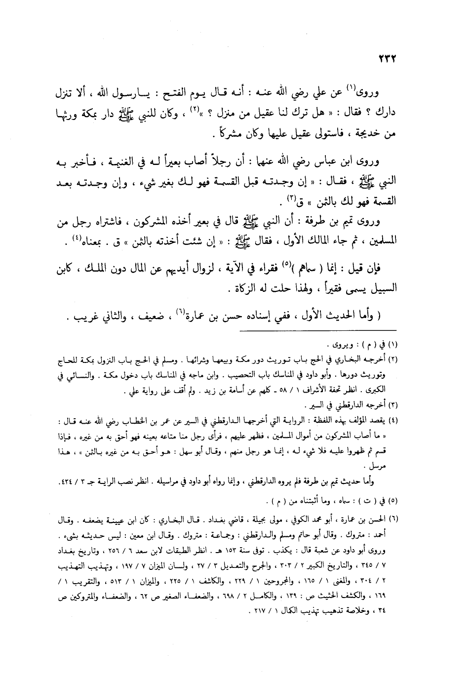 وَرُوِيَ عَن عَليّ رَضِي الله عَنهُ أَنه قَالَ يَوْم الْفَتْح يَا رَسُول الله أَلا تنزل دَارك فَقَالَ هَل ترك لنا عقيل من منزل وَكَانَ للنَّبِي صلى الله عَلَيْهِ وَسلم داربمكة ورثهَا من خَدِيجَة فاستولى عقيل عَلَيْهَا وَكَانَ مُشْركًا