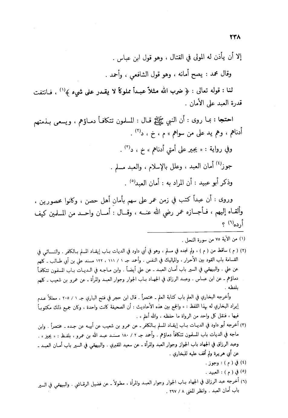 احتجا بِمَا روى أَن النَّبِي صلى الله عَلَيْهِ وَسلم قَالَ الْمُسلمُونَ تَتَكَافَأ دِمَاؤُهُمْ وَيسْعَى بِذِمَّتِهِمْ أَدْنَاهُم وهم يَد على من سواهُم م خَ د وَفِي رِوَايَة يجيرعلى أمتِي أَدْنَاهُم خَ د جوز أَمَان العَبْد وَعلل بِالْإِسْلَامِ وَالْعَبْد مُسلم وَذكر أَبُو عبيد أَن المُرَاد بِهِ أَمَان العَبْد