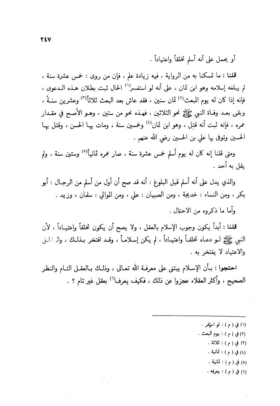 قُلْنَا أبدا يكون وجوب الْإِسْلَام بِالْعقلِ وَلَا يَصح أَن يكون تخلقا واعتيادا لِأَن النَّبِي صلى الله عَلَيْهِ وَسلم لَو دَعَاهُ تخلقا واعتيادا لم يكن إسلاما وَقد افتخر بذلك والتخلق والاعتياد لَا يفتخر بِهِ