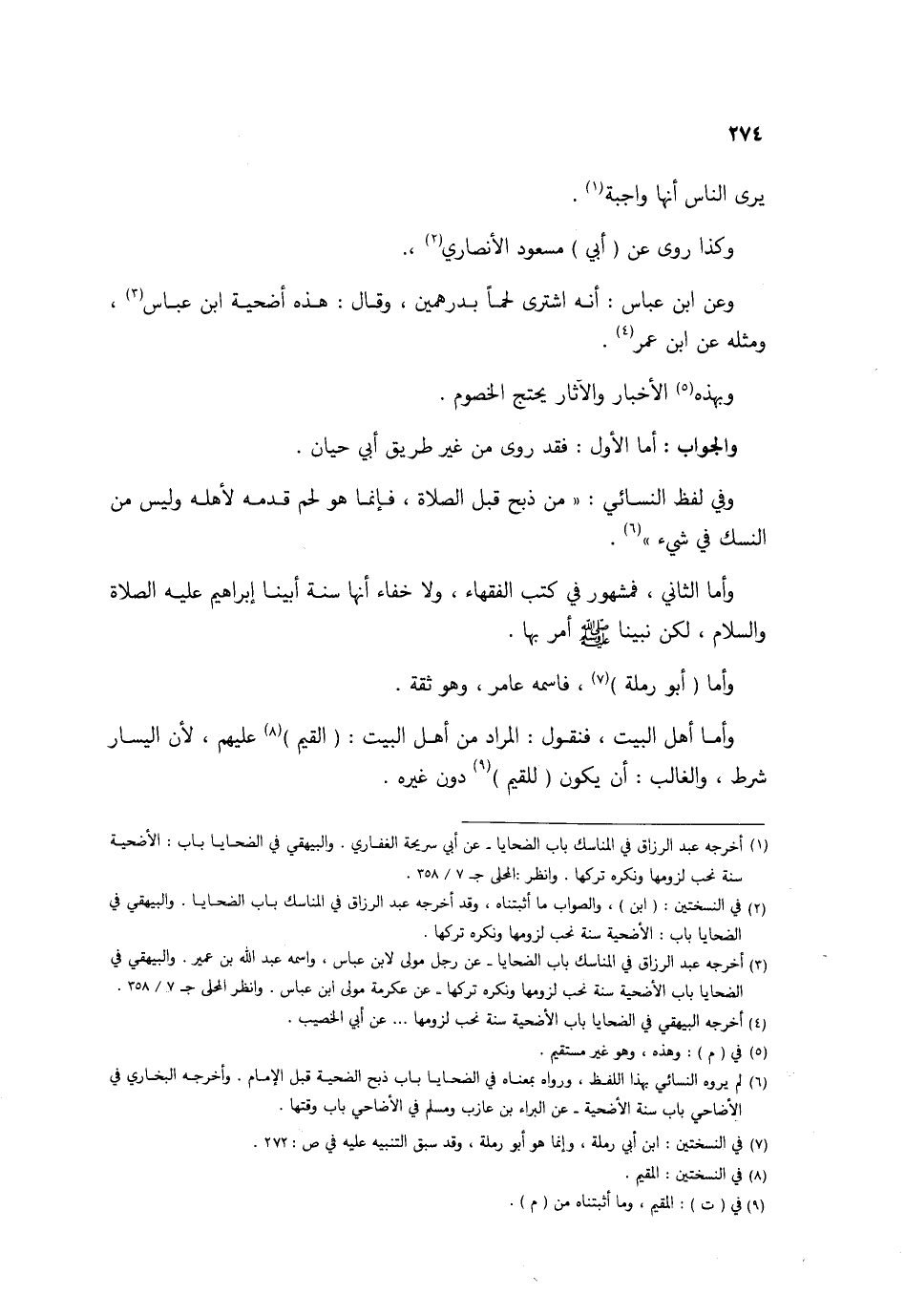 يرى النَّاس أَنَّهَا وَاجِبَة وَكَذَا رُوِيَ عَن (أبي) مَسْعُود الْأنْصَارِيّ وَعَن ابْن عَبَّاس أَنه اشْترى لَحْمًا بِدِرْهَمَيْنِ وَقَالَ هَذِه أضْحِية ابْن عَبَّاس وَمثله عَن ابْن عمر وبهذه الْأَخْبَار والْآثَار يحْتَج الْخُصُوم