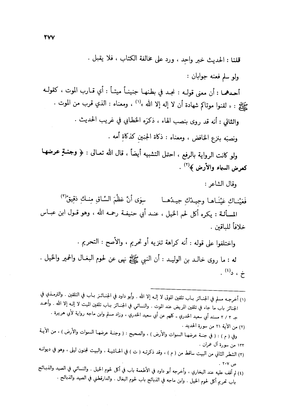 وَالثَّانِي أَنه قد روى بِنصب الْهَاء ذكره الْخطابِيّ فِي غَرِيب الحَدِيث ونصبه بِنَزْع الْخَافِض وَمَعْنَاهُ ذَكَاة الْجَنِين كذكاة أمه وَلَو كَانَت الرِّوَايَة بِالرَّفْع احْتمل التَّشْبِيه أَيْضا قَالَ الله تَعَالَى {وجنة عرضهَا كعرض السَّمَاء وَالْأَرْض} وَقَالَ الشَّاعِر ... فعيناك عَيناهَا وجيدك جيدها ... سوى أَن عظم السَّاق مِنْك دَقِيق ...