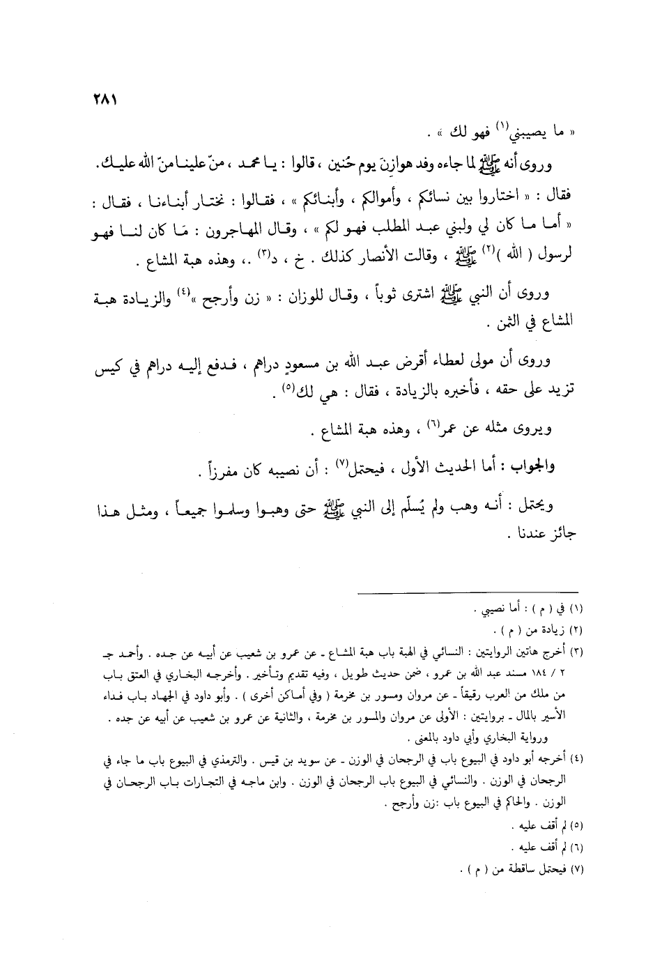 مَا يُصِيبنِي فَهُوَ لَك وروى أَنه صلى الله عَلَيْهِ وَسلم لما جَاءَهُ وَفد هوَازن يَوْم حنين قَالُوا يَا مُحَمَّد من علينا من الله عَلَيْك فَقَالَ اخْتَارُوا بَين نِسَائِكُم وَأَمْوَالكُمْ وأبنائكم فَقَالُوا نَخْتَار أَبْنَائِنَا فَقَالَ أما مَا كَانَ لي ولبني عبد الْمطلب فَهُوَ لكم وَقَالَ الْمُهَاجِرُونَ مَا كَانَ لنا فَهُوَ لرَسُول (الله) صلى الله عَلَيْهِ وَسلم وَقَالَت الْأَنْصَار كَذَلِك خَ د وَهَذِه هبة الْمشَاع وروى أَن النَّبِي صلى الله عَلَيْهِ وَسلم اشْترى ثوبا وَقَالَ للوزان زن وأرجح وَالزِّيَادَة هبة الْمشَاع فِي الثّمن وروى أَن مولى لعطاء أقْرض عبد الله بن مَسْعُود دَرَاهِم فَدفع إِلَيْهِ دَرَاهِم فِي كيس تزيد على حَقه فَأخْبرهُ بِالزِّيَادَةِ فَقَالَ هِيَ لَك ويروى مثله عَن عمر وَهَذِه هبة الْمشَاع