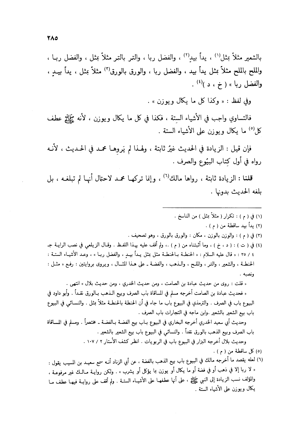 بِالشَّعِيرِ مثلا بِمثل يدا بيد وَالْفضل رَبًّا وَالتَّمْر بِالتَّمْرِ مثلا بِمثل وَالْفضل رَبًّا وَالْملح بالملح مثلا بِمثل يدا بيد وَالْفضل رَبًّا وَالْوَرق بالورق مثلا بِمثل يدا بيد وَالْفضل رَبًّا (خَ د) وَفِي لفظ وَكَذَا كل مَا يُكَال ويوزن فالتساوي وَاجِب فِي الْأَشْيَاء السِّتَّة فَكَذَا فِي كل مَا يُكَال ويوزن لِأَنَّهُ صلى الله عَلَيْهِ وَسلم عطف كل مَا يُكَال ويوزن على الْأَشْيَاء السِّتَّة فَإِن قيل الزِّيَادَة فِي الحَدِيث غير ثَابِتَة وَلِهَذَا لم يروها مُحَمَّد فِي الحَدِيث لِأَنَّهُ رَوَاهُ فِي أول كتاب الْبيُوع وَالصرْف