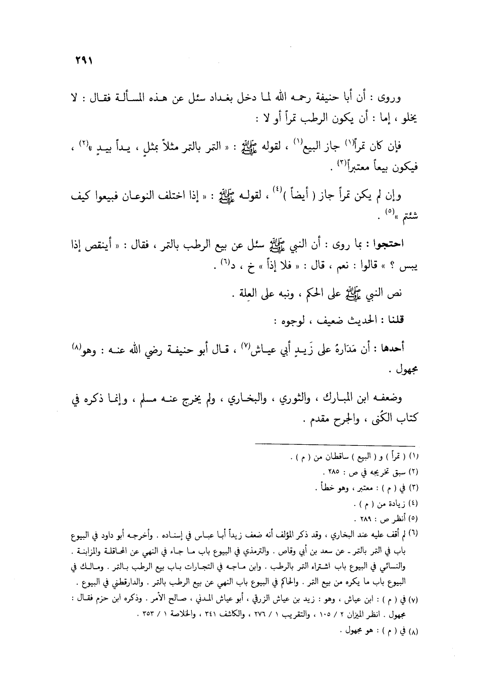 أَحدهمَا أَن مداراة على زيد أبي عَيَّاش قَالَ أَبُو حنيفَة رَضِي الله عَنهُ وَهُوَ مَجْهُول وَضَعفه ابْن الْمُبَارك وَالثَّوْري وَالْبُخَارِيّ وَلم يخرج عَنهُ مُسلم وَإِنَّمَا ذكره فِي كتاب الكنى وَالْجرْح مقدم