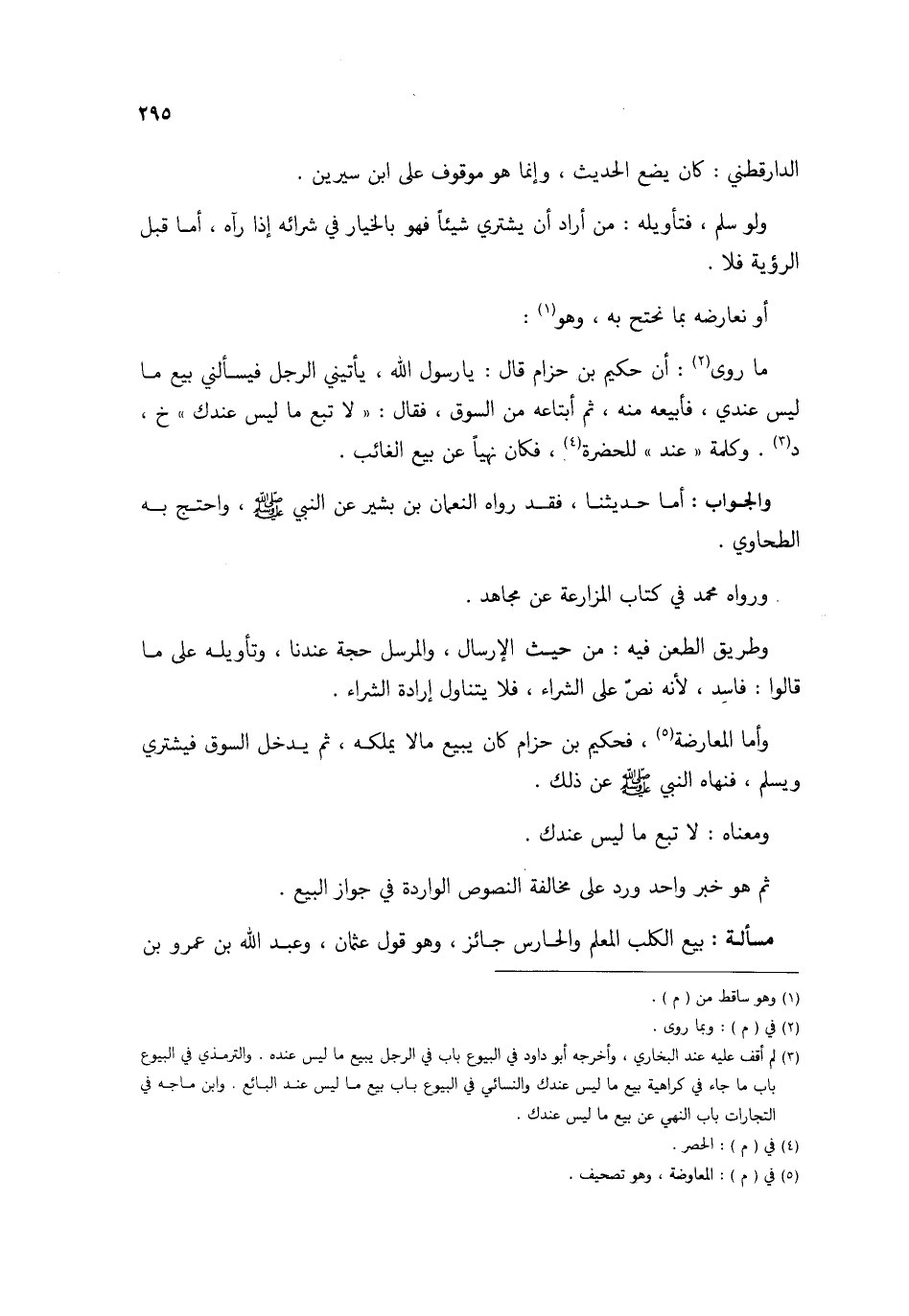 الدَّارَقُطْنِيّ كَانَ يضع الحَدِيث وَإِنَّمَا هُوَ مَوْقُوف على ابْن سِيرِين وَلَو سلم فتأويله من أَرَادَ أَن يَشْتَرِي شَيْئا فَهُوَ بِالْخِيَارِ فِي شِرَائِهِ إِذا رَآهُ أما قبل الرُّؤْيَة فَلَا أَو نعارضه بِمَا نحتج بِهِ وَهُوَ مَا رُوِيَ أَن حَكِيم بن حزَام قَالَ يَا رَسُول الله يأتيني الرجل فيسألني بيع مَا لَيْسَ عِنْدِي فأبيعه مِنْهُ ثمَّ ابتاعه من السُّوق فَقَالَ لَا تبع مَا لَيْسَ عنْدك خَ د وَكلمَة عِنْد للحضرة فَكَانَ نهيا عَن بيع الْغَائِب