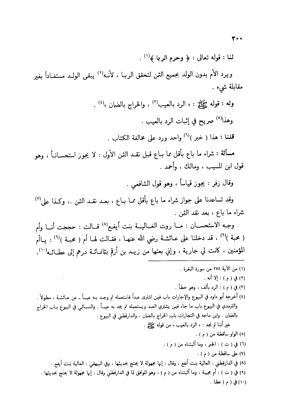 وَيرد الْأُم بِدُونِ الْوَلَد بِجَمِيعِ الثّمن لتحَقّق الرِّبَا لِأَنَّهُ يبْقى الْوَلَد مستفادا بِغَيْر مُقَابلَة شَيْء وَله قَوْله صلى الله عَلَيْهِ وَسلم الرَّد بِالْعَيْبِ وَالْخَرَاج بِالضَّمَانِ وَهَذَا صَرِيح فِي إِثْبَات الرَّد بِالْعَيْبِ قُلْنَا هَذَا خبر وَاحِد ورد على مُخَالفَة الْكتاب مَسْأَلَة شِرَاء مَا بَاعَ بِأَقَلّ مِمَّا بَاعَ قبل نقد الثّمن الأول لَا يجوز اسْتِحْسَانًا وَهُوَ قَول ابْن الْمسيب وَمَالك وَأحمد وَقَالَ زفر يجوز قِيَاسا وَهُوَ قَول الشَّافِعِي
