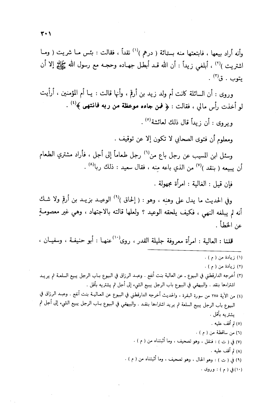 وروى أَن السائلة كَانَت أم ولد زيد بن أَرقم وَأَنَّهَا قَالَت ياأم الْمُؤمنِينَ أَرَأَيْت لَو أخذت رَأس مَالِي فَقَالَت {فَمن جَاءَهُ موعظة من ربه فَانْتهى} ويروى أَن زيدا قَالَ ذَلِك لعَائِشَة وَمَعْلُوم أَن فَتْوَى الصَّحَابِيّ لَا تكون إِلَّا عَن تَوْقِيف