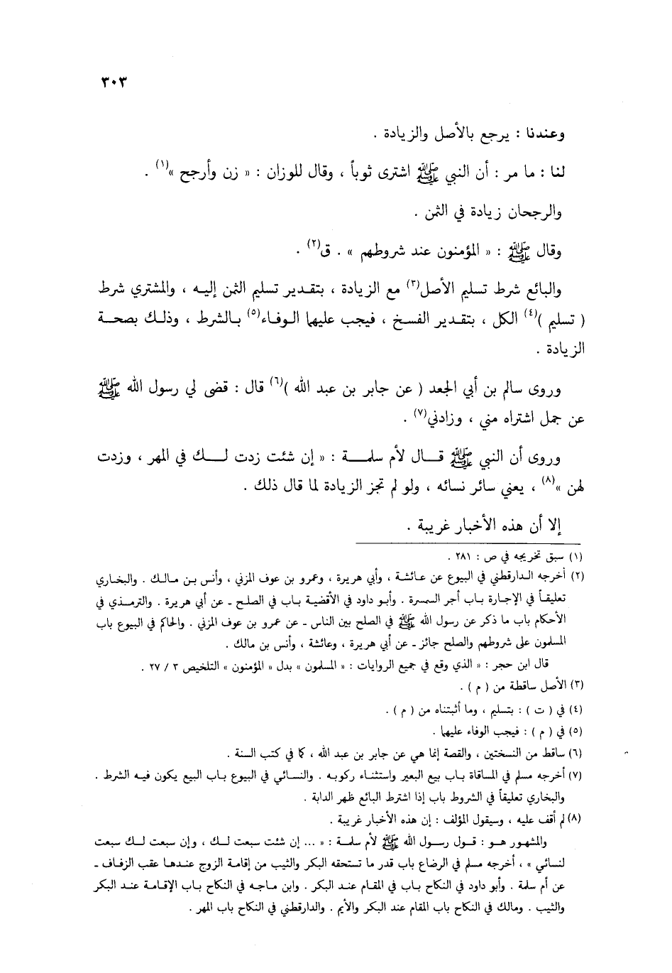 وَعِنْدنَا يرجع بِالْأَصْلِ وَالزِّيَادَة لنا مَا مر أَن النَّبِي صلى الله عَلَيْهِ وَسلم اشْترى ثوبا وَقَالَ للوزان زن وأرجح والرجحان زِيَادَة فِي الثّمن وَقَالَ صلى الله عَلَيْهِ وَسلم الْمُؤْمِنُونَ عِنْد شروطهم ق