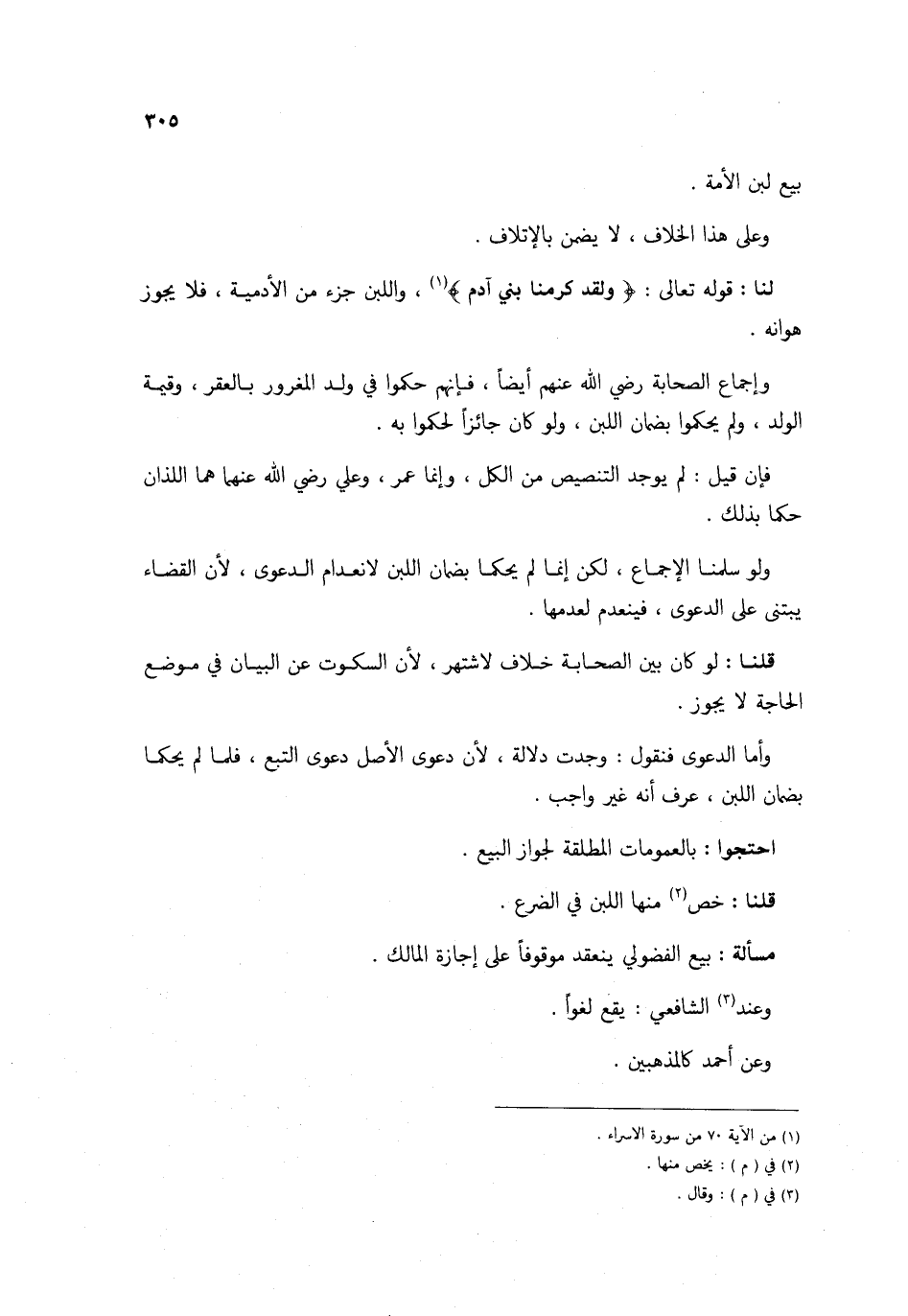 بيع لبن الْأمة وعَلى هَذَا الْخلاف لَا يضمن بِالْإِتْلَافِ لنا قَوْله تَعَالَى {وَلَقَد كرمنا بني آدم} وَاللَّبن جُزْء من الْآدَمِيَّة فَلَا يجوز هوانه