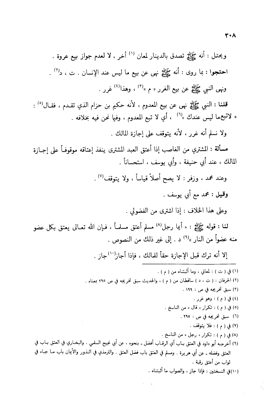 قُلْنَا النَّبِي صلى الله عَلَيْهِ وَسلم نهى عَن بيع الْمَعْدُوم لِأَنَّهُ حَكِيم بن حزَام الَّذِي تقدم فَقَالَ لَا تبع مَا لَيْسَ عنْدك أَي لَا تبع الْمَعْدُوم وَفِيمَا نَحن فِيهِ بخلافة وَلَا نسلم أَنه غرر لِأَنَّهُ يتَوَقَّف على إجَازَة الْمَالِك