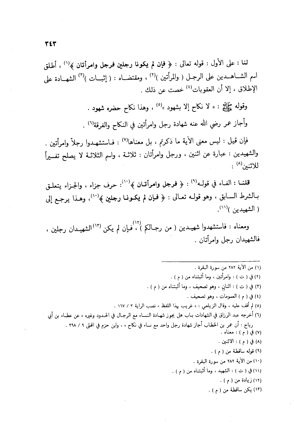 فَإِن قيل لَيْسَ معنى الْآيَة مَا ذكرْتُمْ بل مَعْنَاهُ فاستشهدوا رجلا وَامْرَأَتَيْنِ والشهيدين عبارَة عَن اثْنَيْنِ وَرجل وَامْرَأَتَانِ ثَلَاثَة وَاسم الثَّلَاثَة لَا يصلح تَفْسِيرا للإثنين قُلْنَا الْفَاء فِي قَوْله {فَرجل وَامْرَأَتَانِ} حرف جَزَاء وَالْجَزَاء يتَعَلَّق بِالشّرطِ السَّابِق وَهُوَ قَوْله تَعَالَى {فَإِن لم يَكُونَا رجلَيْنِ} وَهَذَا يرجع إِلَى (الشهيدين)