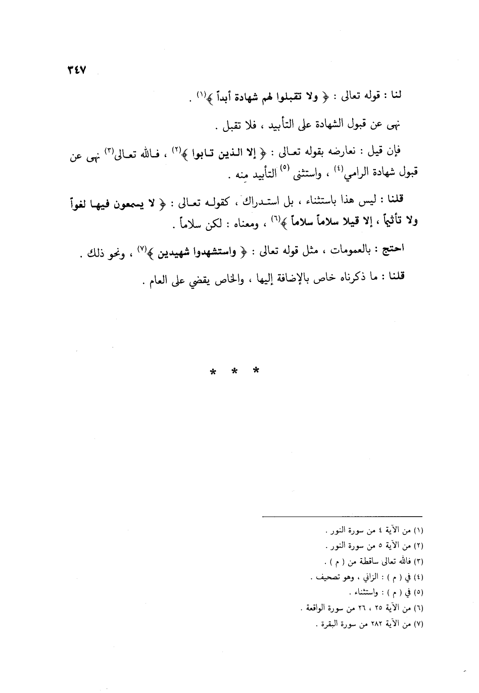 قُلْنَا لَيْسَ هَذَا باستثناء بل اسْتِدْرَاك كَقَوْلِه تَعَالَى {لَا يسمعُونَ فِيهَا لَغوا وَلَا تأثيما إِلَّا قيلا سَلاما سَلاما} ومعنا لَكِن سَلاما احْتج بالعمومات مثل قَوْله تَعَالَى {واستشهدوا شهيدين} وَنَحْو ذَلِك قُلْنَا مَا ذَكرْنَاهُ خَاص بِالْإِضَافَة إِلَيْهَا وَالْخَاص يقْضِي على الْعَام