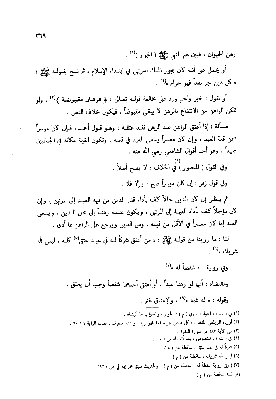 مَسْأَلَة إِذا أعتق الرَّاهِن عبد الرَّهْن نفذ عتقه وَهُوَ قَول أَحْمد فَإِن كَانَ مُوسِرًا ضمن قيمَة العَبْد وَإِن كَانَ مُعسرا يسْعَى العَبْد فِي قِيمَته وَتَكون الْقيمَة مَكَانَهُ فِي الْجَانِبَيْنِ جَمِيعًا وَهُوَ أحد أَقْوَال الشَّافِعِي رَضِي الله عَنهُ وَفِي القَوْل (الْمَنْصُور) فِي الْخلاف لَا يَصح أصلا وَفِي قَول زفر إِن كَانَ مُوسِرًا صَحَّ وَإِلَّا فَلَا