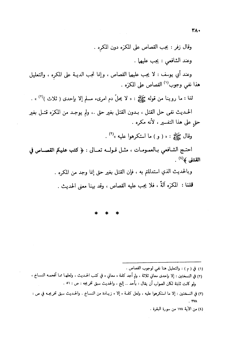 الحَدِيث نفى حل الْقَتْل بِدُونِ الْقَتْل بِغَيْر حق وَلم يُوجد من الْمُكْره قتل بِغَيْر حق على هَذَا التَّفْسِير لِأَنَّهُ مكره وَقَالَ صلى الله عَلَيْهِ وَسلم (و) مَا اسْتكْرهُوا عَلَيْهِ احْتج الشَّافِعِي بالعمومات مثل قَوْله تَعَالَى {كتب عَلَيْكُم الْقصاص فِي الْقَتْلَى} وَبِالْحَدِيثِ الَّذِي استدللتم بِهِ فَإِن الْقَتْل بِغَيْر حق إِنَّمَا وجد من الْمُكْره قُلْنَا الْمَكْر آلَة فَلَا يجب عَلَيْهِ الْقصاص وَقد بَينا معنى الحَدِيث