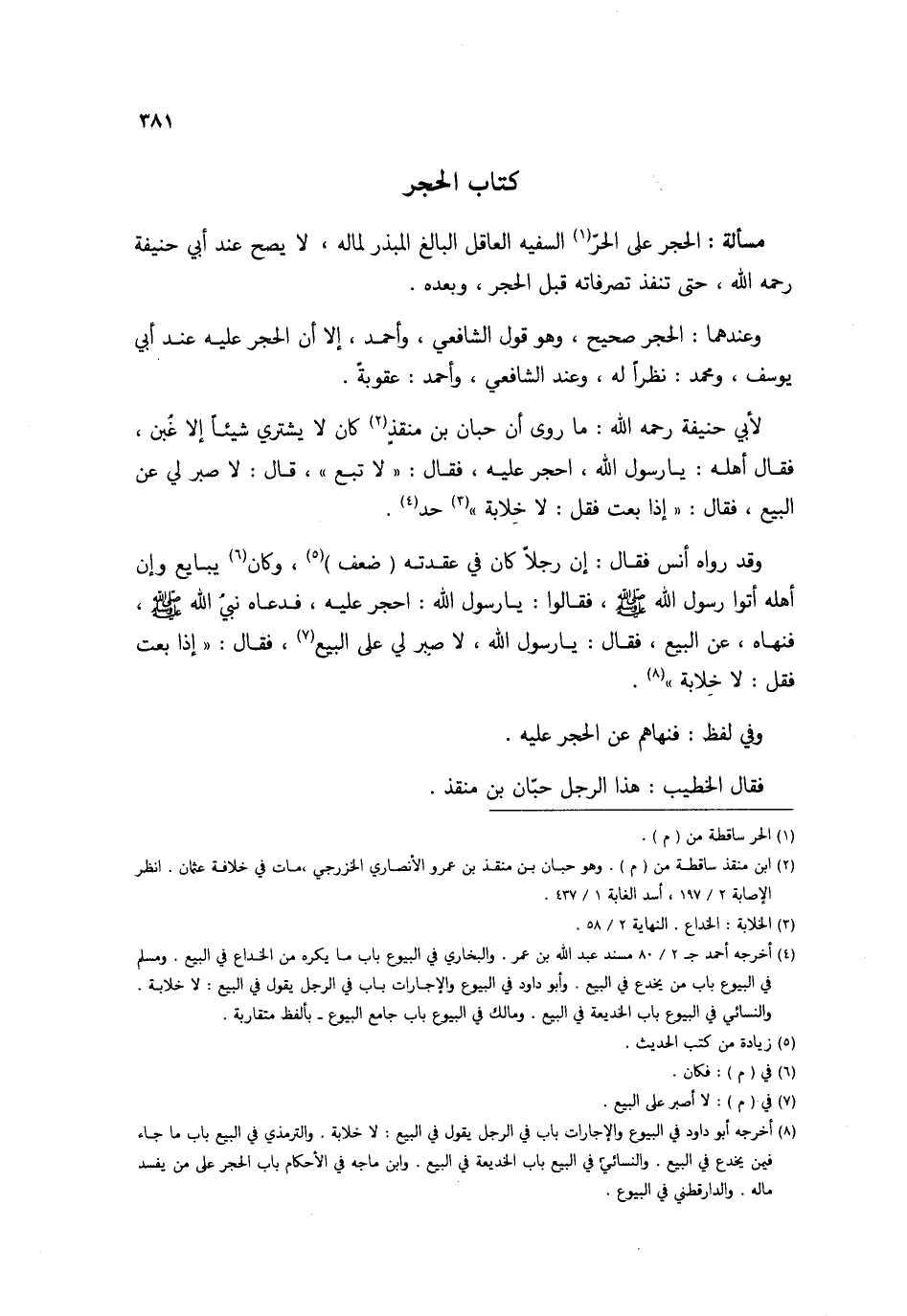 لأبي حنيفَة رَحمَه الله مَا روى أَن حبَان بن منقذ كَانَ لَا يَشْتَرِي شَيْئا إِلَّا غبن فَقَالَ أَهله يار سَوَّلَ الله احجر عَلَيْهِ فَقَالَ لاتبع قَالَ لَا صَبر لي عَن البيع فَقَالَ إِذا بِعْت فَقل لَا خلابة حد