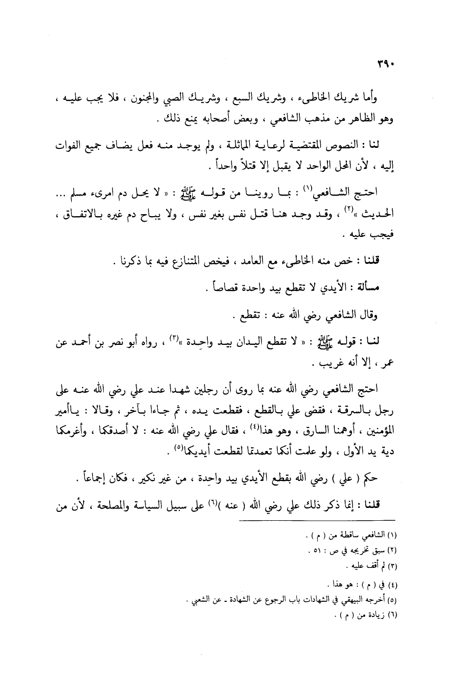 احْتج الشَّافِعِي بِمَا روينَا من قَوْله صلى الله عَلَيْهِ وَسلم لَا يحل دم امرىء مُسلم الحَدِيث وَقد وجد هُنَا قتل نفس بِغَيْر نفس وَلَا يُبَاح دم غَيره بالِاتِّفَاقِ فَيجب عَلَيْهِ قُلْنَا خص مِنْهُ الخاطى مَعَ الْعَامِد فيخص الْمُتَنَازع فِيهِ بِمَا ذكرنَا مَسْأَلَة الْأَيْدِي لَا تقطع بيد وَاحِدَة قصاصا وَقَالَ الشَّافِعِي رَضِي الله عَنهُ تقطع