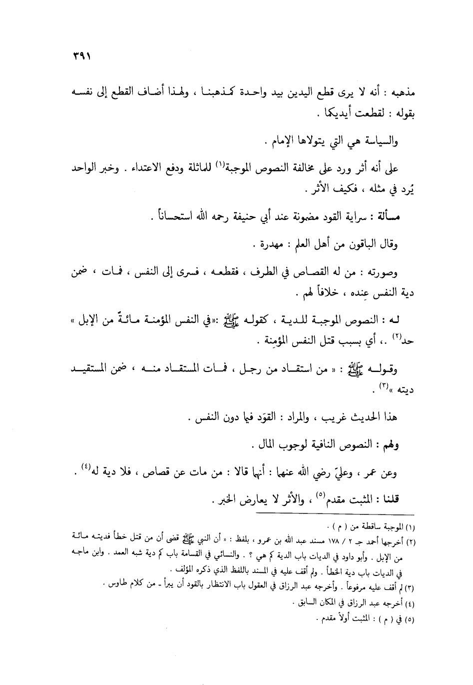على أَنه أثر ورد على مُخَالفَة النُّصُوص الْمُوجبَة للمماثلة وَدفع الاعتداء وَخبر الْوَاحِد يرد فِي مثله فَكيف الْأَثر مَسْأَلَة سرَايَة الْقود مَضْمُونَة عِنْد أبي حنيفَة رَحمَه الله اسْتِحْسَانًا وَقَالَ الْبَاقُونَ من أهل الْعلم مهدرة