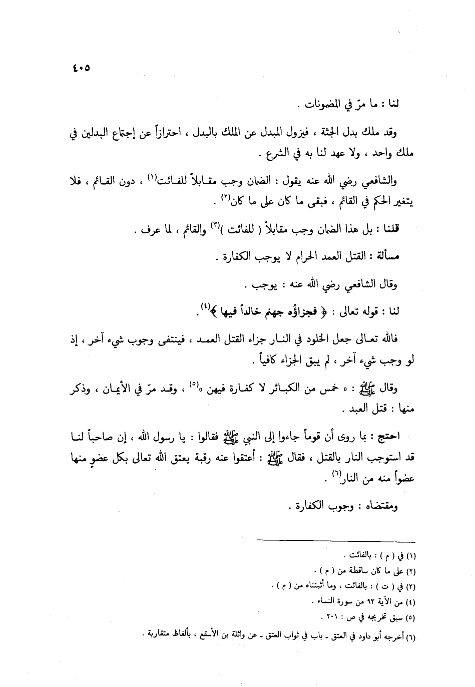 وَالشَّافِعِيّ رَضِي الله عَنهُ يَقُول الضَّمَان وَجب مُقَابلا للفائت دون الْقَائِم فَلَا يتَغَيَّر الحكم فِي الْقَائِم فَبَقيَ مَا كَانَ على مَا كَانَ قُلْنَا بل هَذَا الضَّمَان وَجب مُقَابلا (للفائت) والقائم لما عرف مَسْأَلَة الْقَتْل الْعمد الْحَرَام لَا يُوجب الْكَفَّارَة وَقَالَ الشَّافِعِي رَضِي الله عَنهُ يُوجب لنا قَوْله تَعَالَى {فَجَزَاؤُهُ جَهَنَّم خَالِدا فِيهَا}