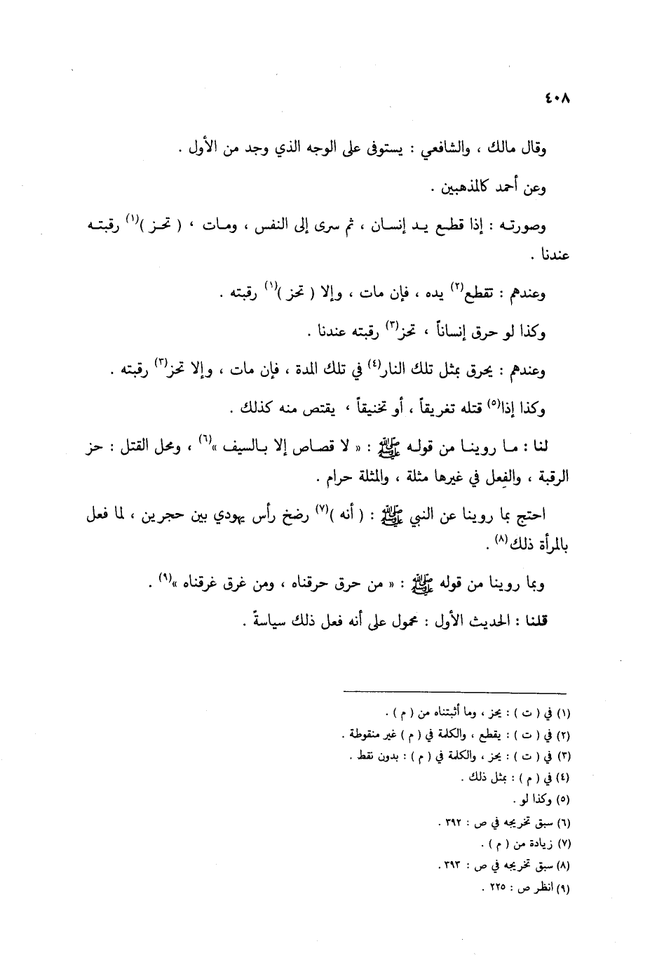 وَقَالَ مَالك وَالشَّافِعِيّ يسْتَوْفى على الْوَجْه الَّذِي وجد من الأول وَعَن أَحْمد كالمذهبين وَصورته إِذا قطع يَد إِنْسَان ثمَّ سرى إِلَى النَّفس وَمَات (تحز) رقبته عندنَا وَعِنْدهم تقطع يَده فَإِن مَاتَ وَإِلَّا (تحز) رقبته وَكَذَا لَو حرق إنْسَانا تحز رقبته عندنَا