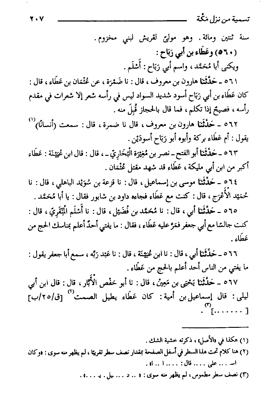 561- حَدَّثَنا هَارُون بْن معروف، قال: حدثنا ضَمْرَة، عَنْ عُثْمَان بْن عَطَاء، قَالَ: كَانَ عَطَاء بْن أبي رَبَاح أسود شديد السواد ليس فِي رأسه شعر إِلا شعرات فِي مقدم رأسه، فصيحٌ إذا تكلم، فما قَالَ بالحجاز قُبِلَ منه.
