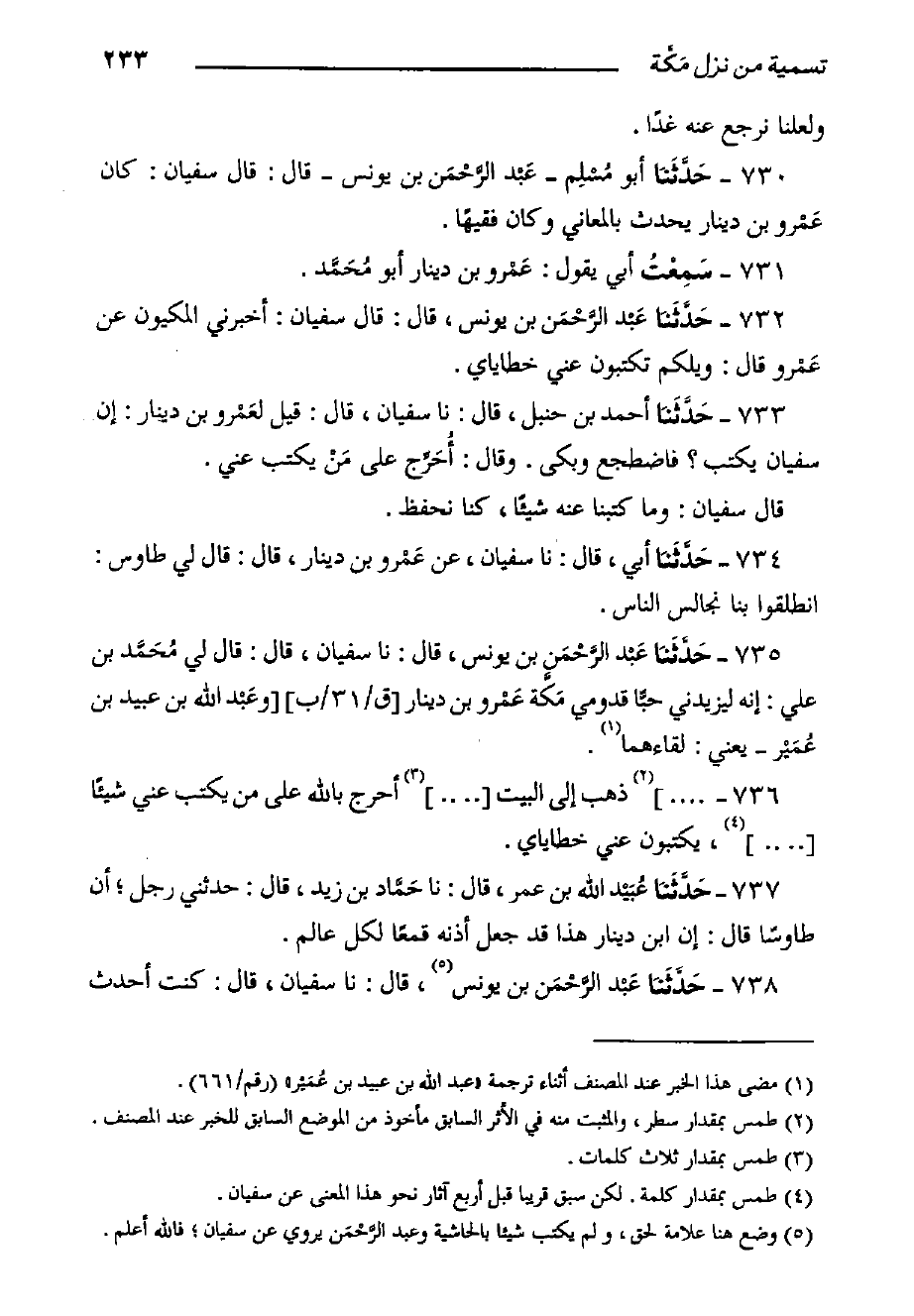 733- حَدَّثَنا أَحْمَدُ بْنُ حنبل, قال: حدثنا سُفْيَانُ, قَالَ: قيل لعَمْرو بْن دينار: إن سفيان يكتب؟ فاضطجع وبكى. وَقَالَ: أُحَرِّج عَلَى مَنْ يكتب عني.